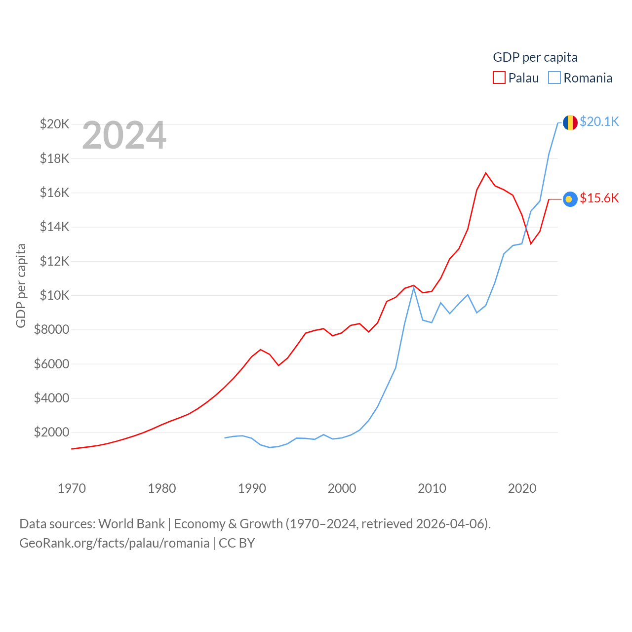 By GDP, Palau ranks 194/197 ($277M) and Romania ranks 42/197 ($383B). By GDP per capita, Palau ranks 67/197 ($15,611), while Romania ranks 58/197 ($20,080).