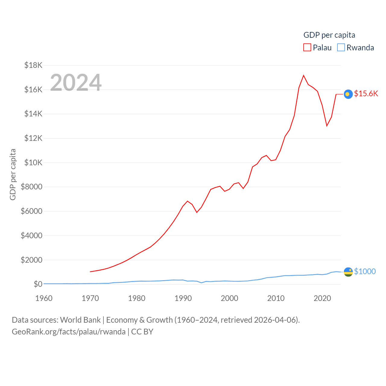 By GDP, Palau ranks 194/197 ($277M) and Rwanda ranks 144/197 ($14.3B). By GDP per capita, Palau ranks 67/197 ($15,611), while Rwanda ranks 178/197 ($1,000).
