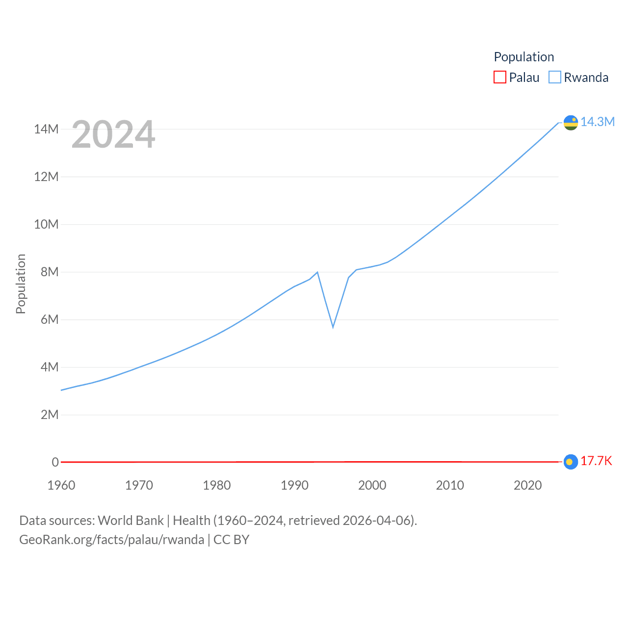Palau has a population of 17.7K (ranked 194/197), compared with 14.3M in Rwanda (ranked 77/197). Palau's land area is 177.6 sq mi versus 9,525 sq mi for Rwanda (ranked 180th vs. 146th).