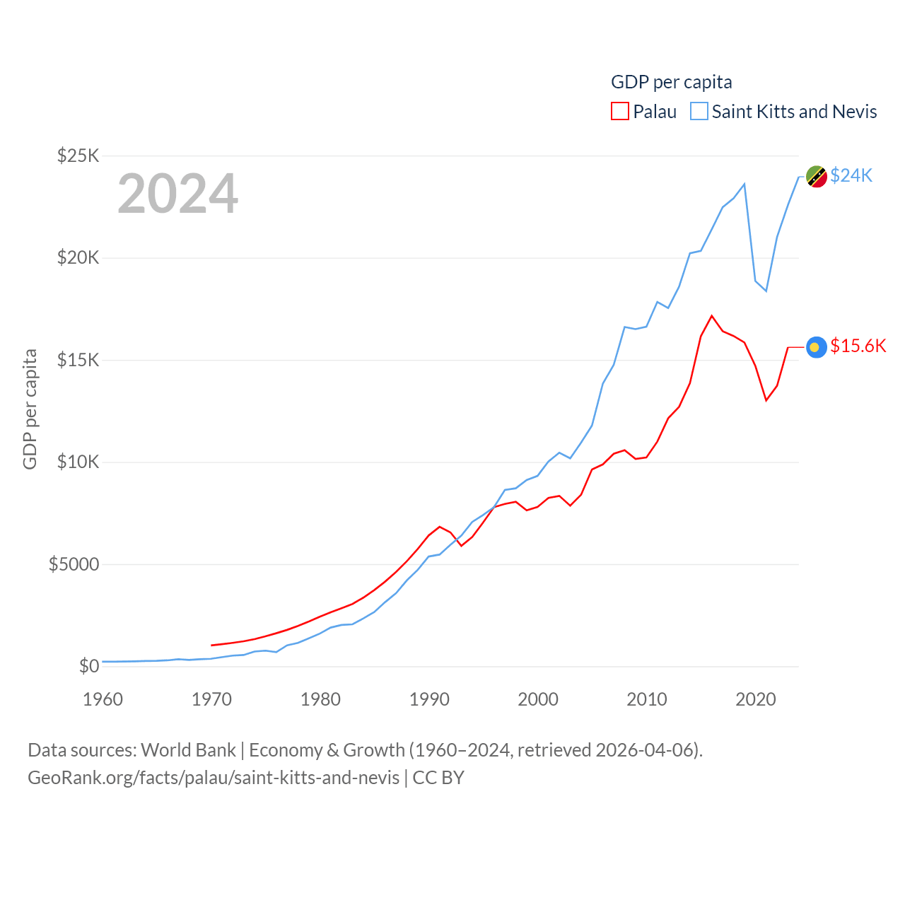 By GDP, Palau ranks 194/197 ($277M) and Saint Kitts and Nevis ranks 187/197 ($1.12B). By GDP per capita, Palau ranks 67/197 ($15,611), while Saint Kitts and Nevis ranks 51/197 ($23,961).