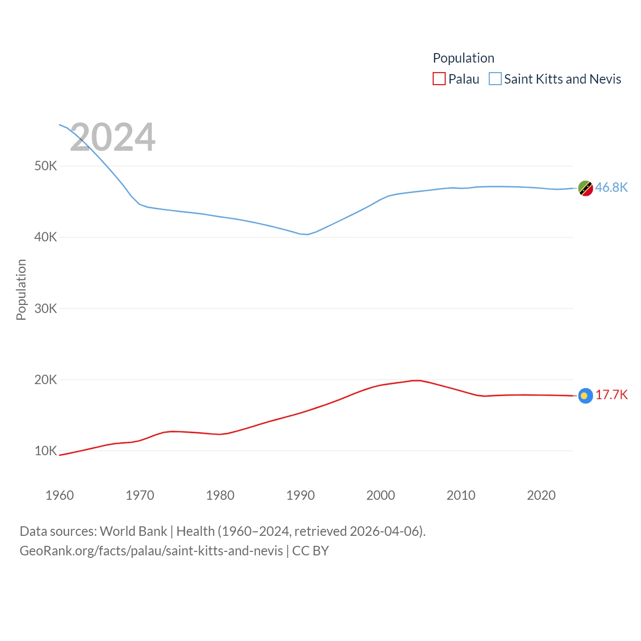 Palau has a population of 17.7K (ranked 194/197), compared with 46.8K in Saint Kitts and Nevis (ranked 189/197). Palau's land area is 177.6 sq mi versus 100.4 sq mi for Saint Kitts and Nevis (ranked 180th vs. 189th).