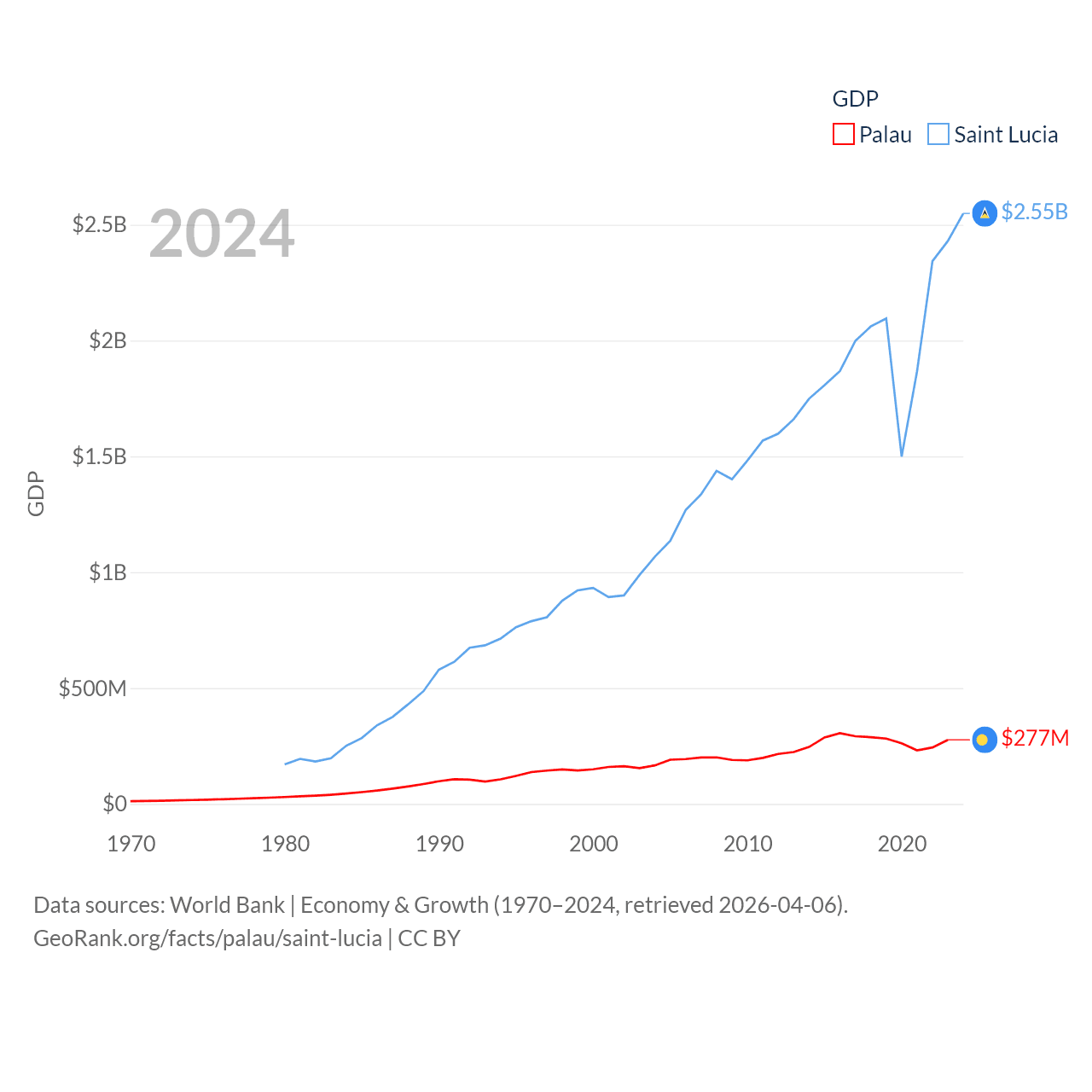 By GDP, Palau ranks 194/197 ($277M) and Saint Lucia ranks 173/197 ($2.55B). By GDP per capita, Palau ranks 67/197 ($15,611), while Saint Lucia ranks 70/197 ($14,182).