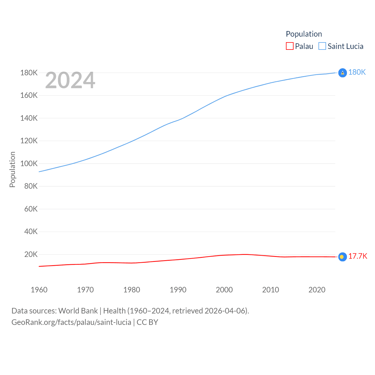 Palau has a population of 17.7K (ranked 194/197), compared with 180K in Saint Lucia (ranked 178/197). Palau's land area is 177.6 sq mi versus 235.5 sq mi for Saint Lucia (ranked 180th vs. 178th).