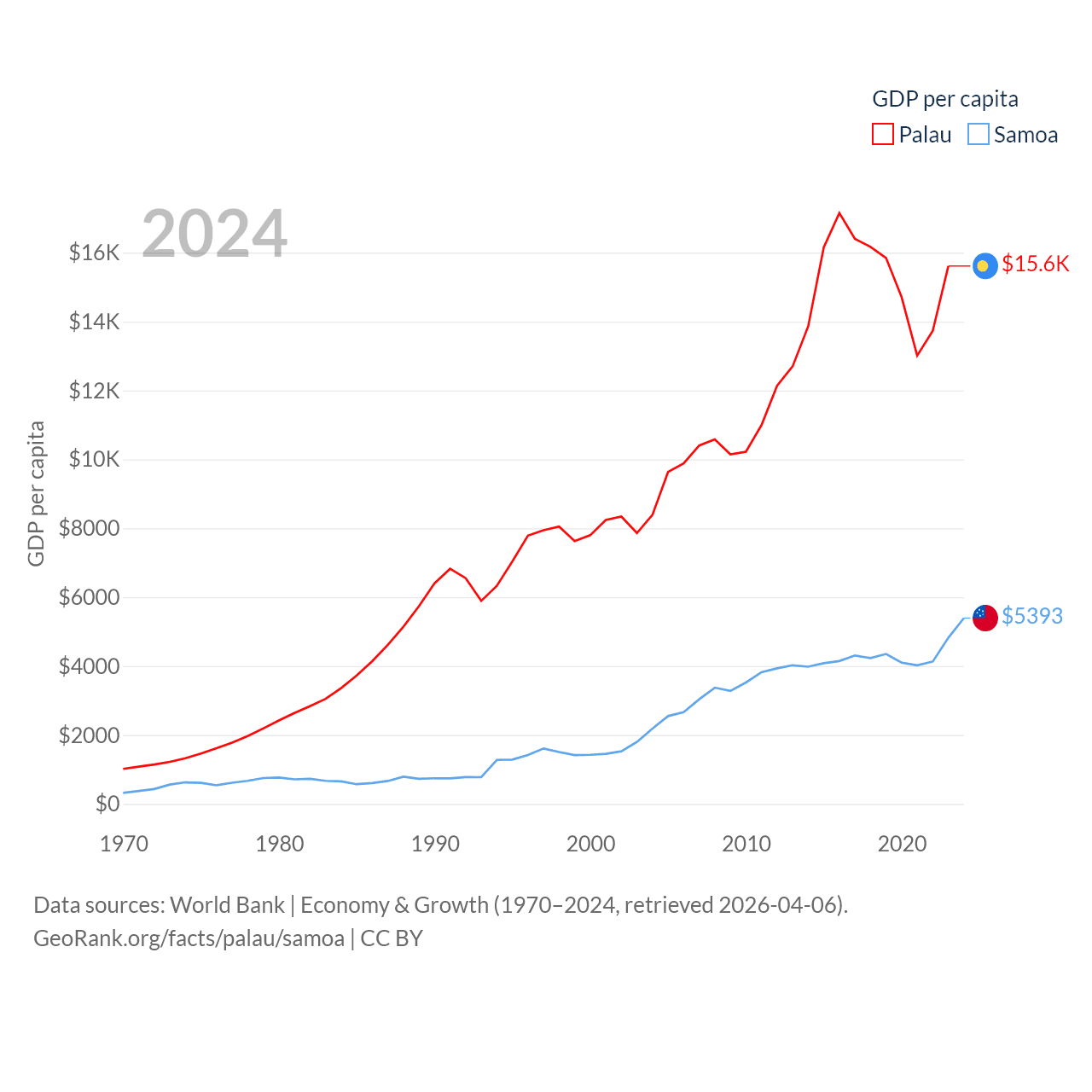 By GDP, Palau ranks 194/197 ($277M) and Samoa ranks 185/197 ($1.18B). By GDP per capita, Palau ranks 67/197 ($15,611), while Samoa ranks 117/197 ($5,393).