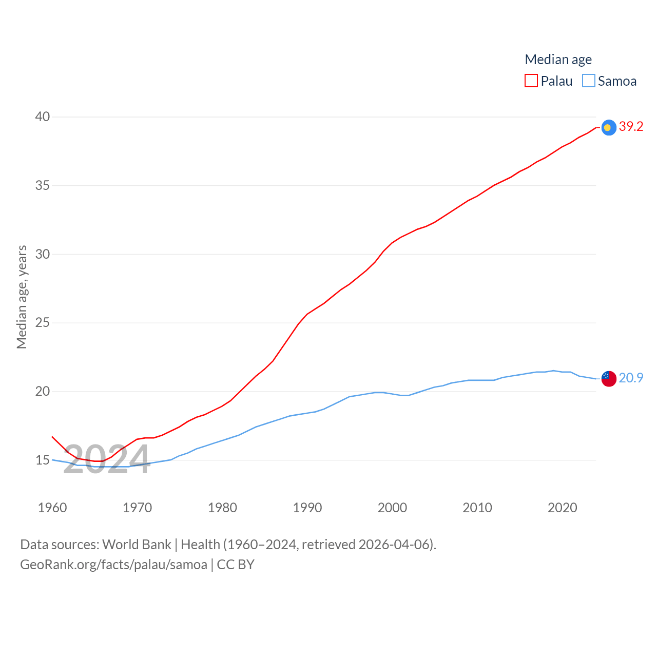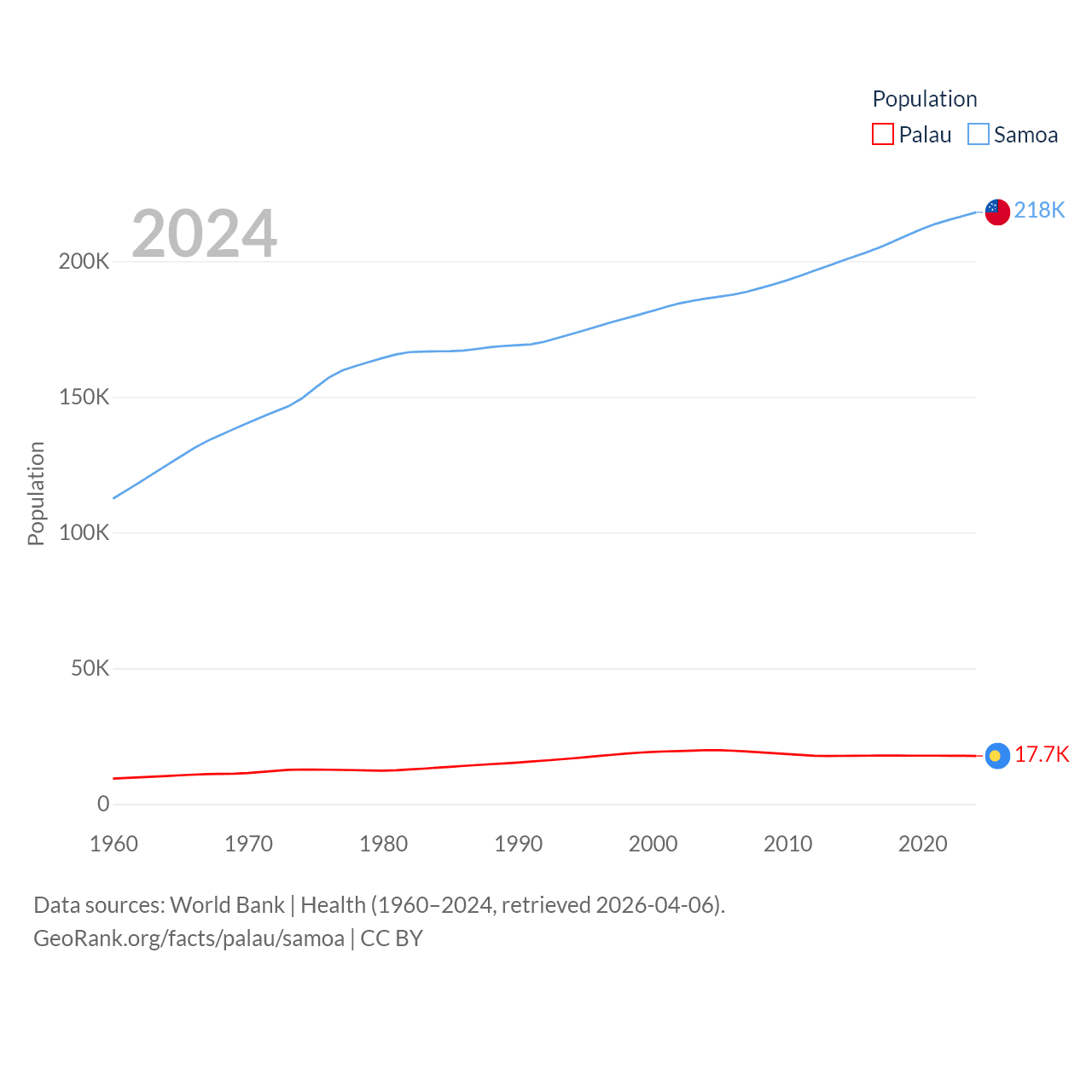 Palau has a population of 17.7K (ranked 194/197), compared with 218K in Samoa (ranked 177/197). Palau's land area is 177.6 sq mi versus 1,073 sq mi for Samoa (ranked 180th vs. 168th).