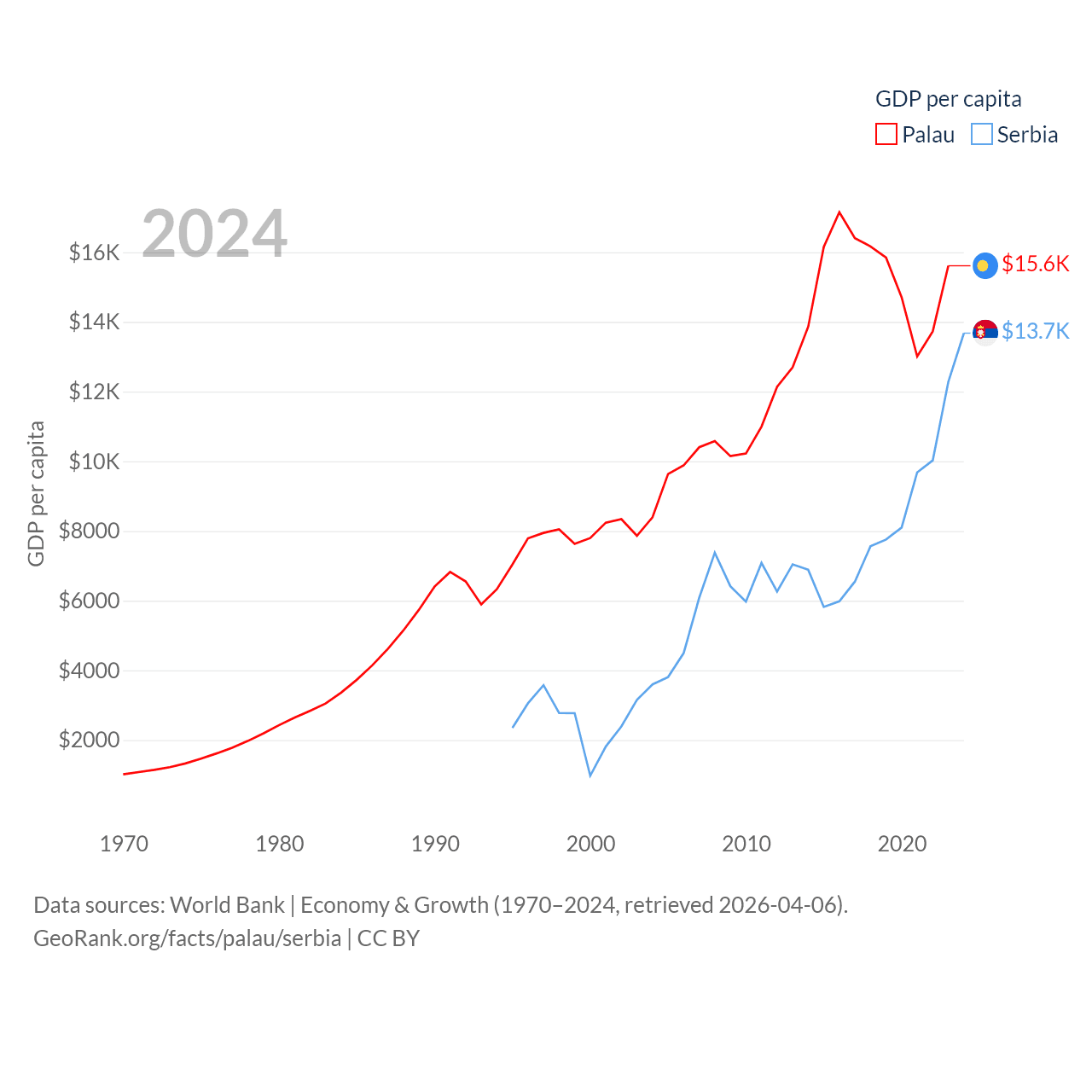By GDP, Palau ranks 194/197 ($277M) and Serbia ranks 76/197 ($90.1B). By GDP per capita, Palau ranks 67/197 ($15,611), while Serbia ranks 73/197 ($13,679).