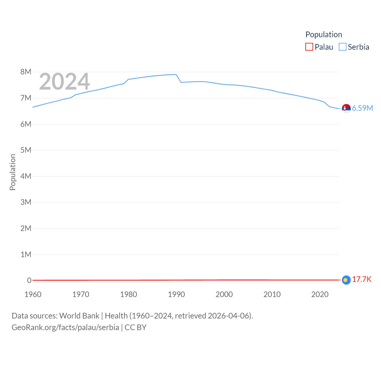 Palau has a population of 17.7K (ranked 194/197), compared with 6.59M in Serbia (ranked 109/197). Palau's land area is 177.6 sq mi versus 32,467 sq mi for Serbia (ranked 180th vs. 111th).
