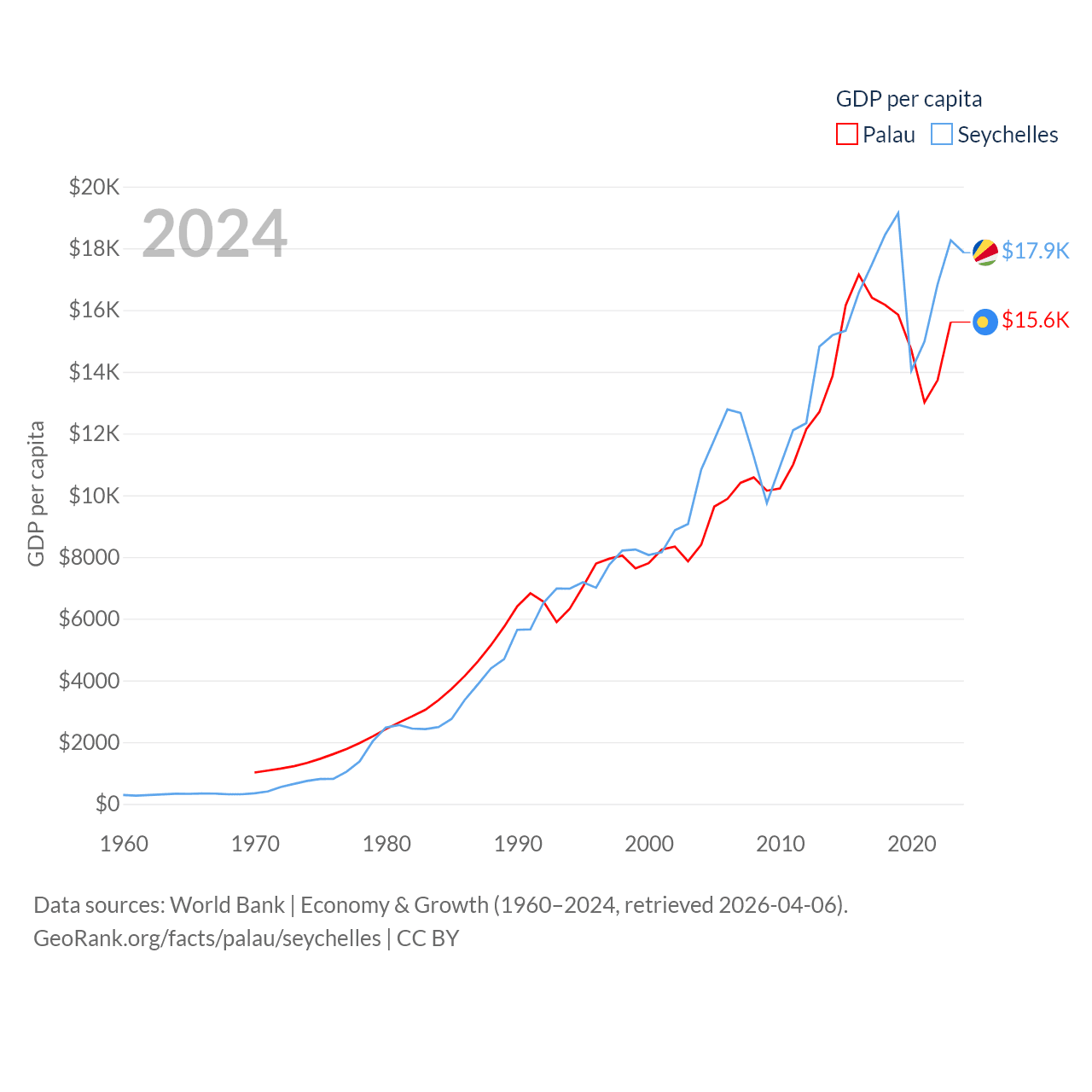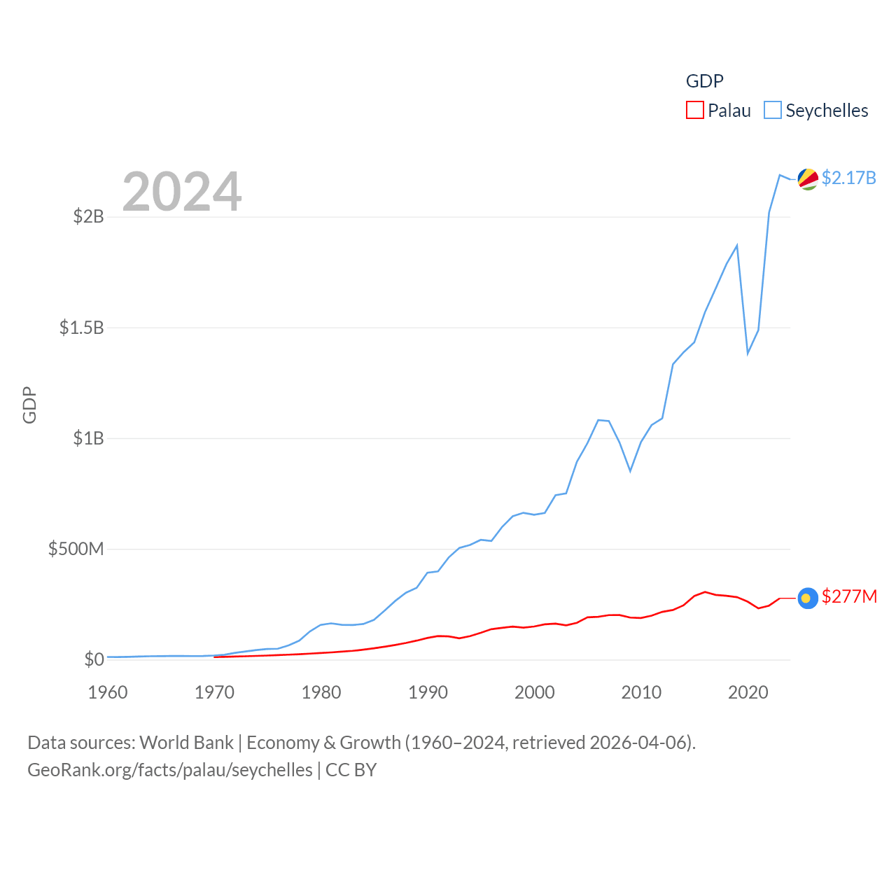 By GDP, Palau ranks 194/197 ($277M) and The Seychelles ranks 178/197 ($2.17B). By GDP per capita, Palau ranks 67/197 ($15,611), while The Seychelles ranks 63/197 ($17,859).