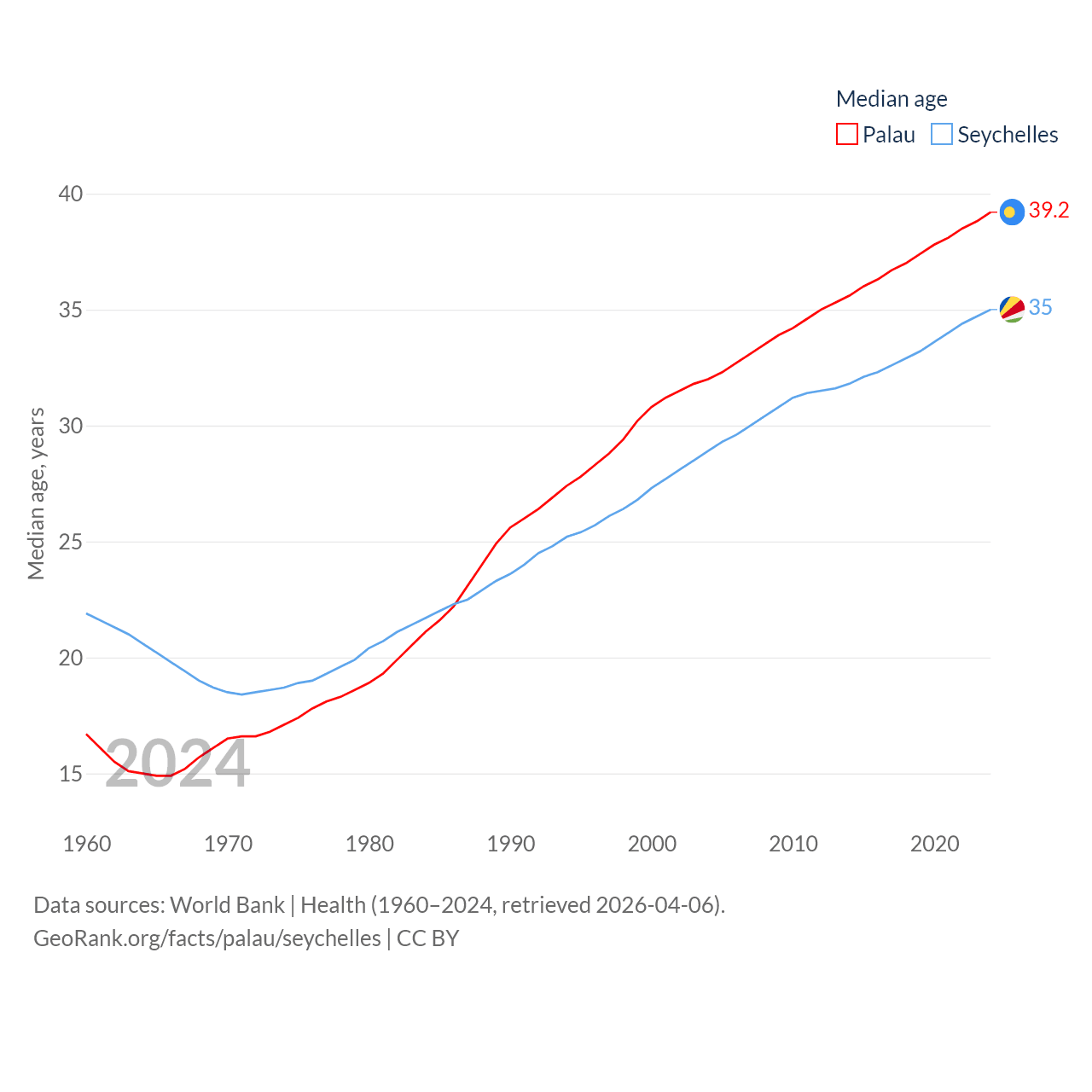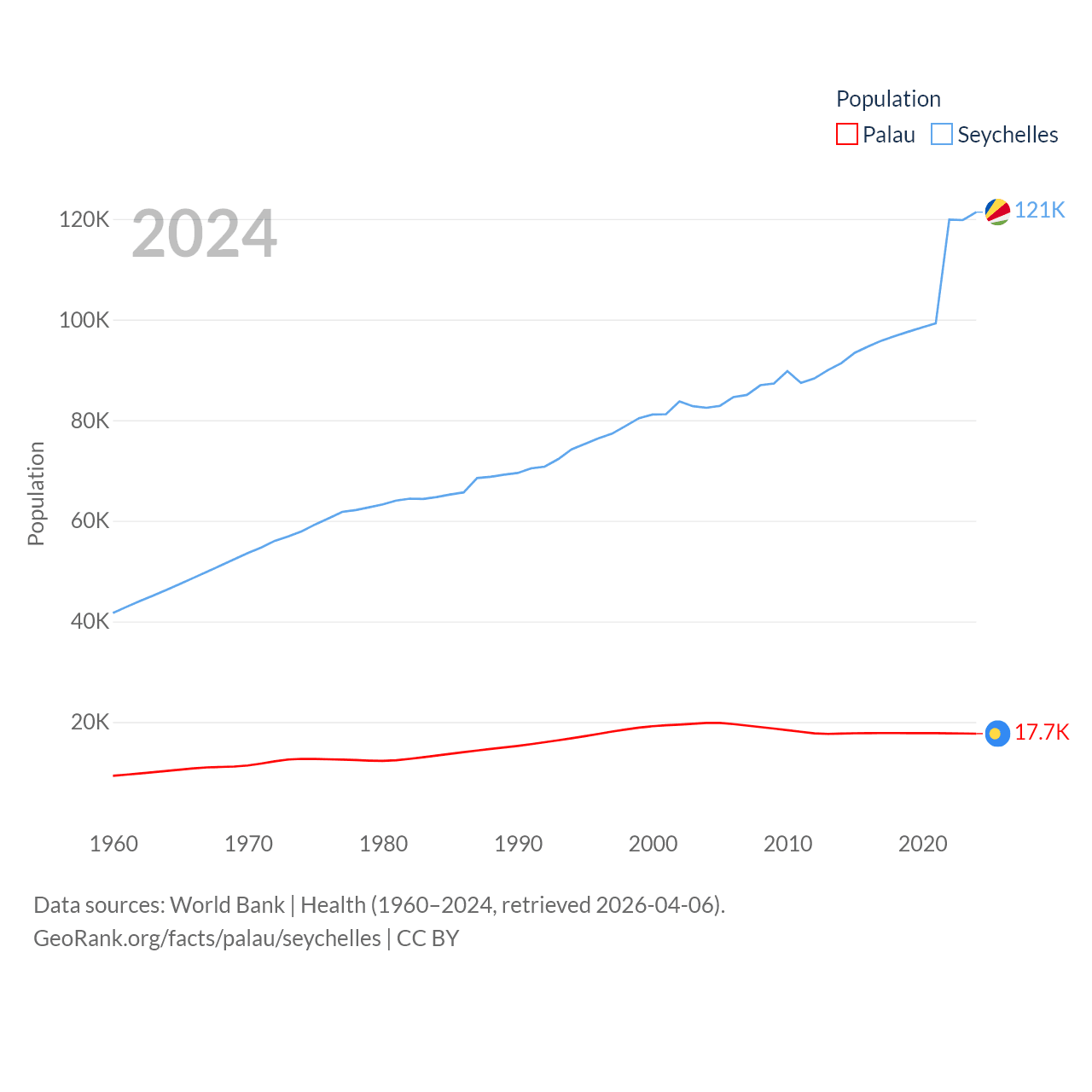 Palau has a population of 17.7K (ranked 194/197), compared with 121K in The Seychelles (ranked 181/197). Palau's land area is 177.6 sq mi versus 177.6 sq mi for The Seychelles (ranked 180th vs. 181st).