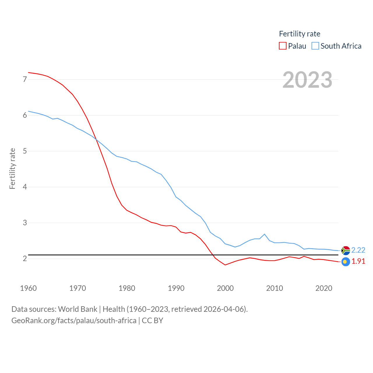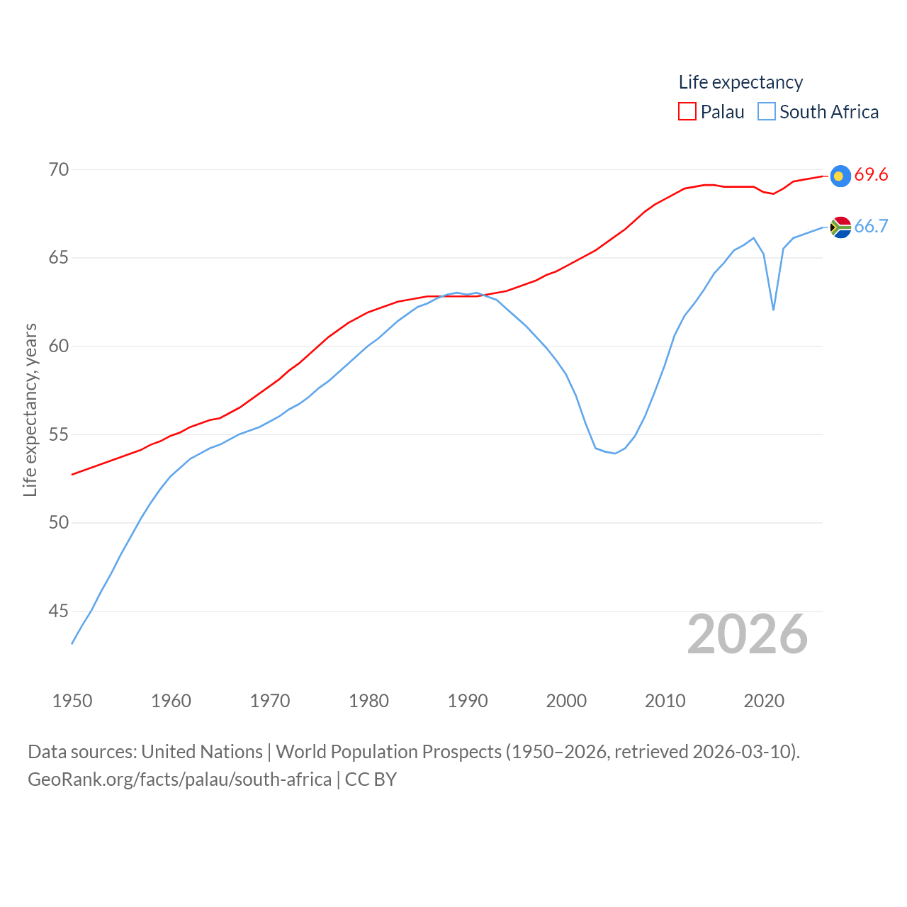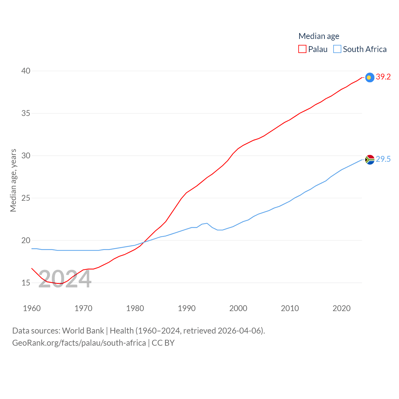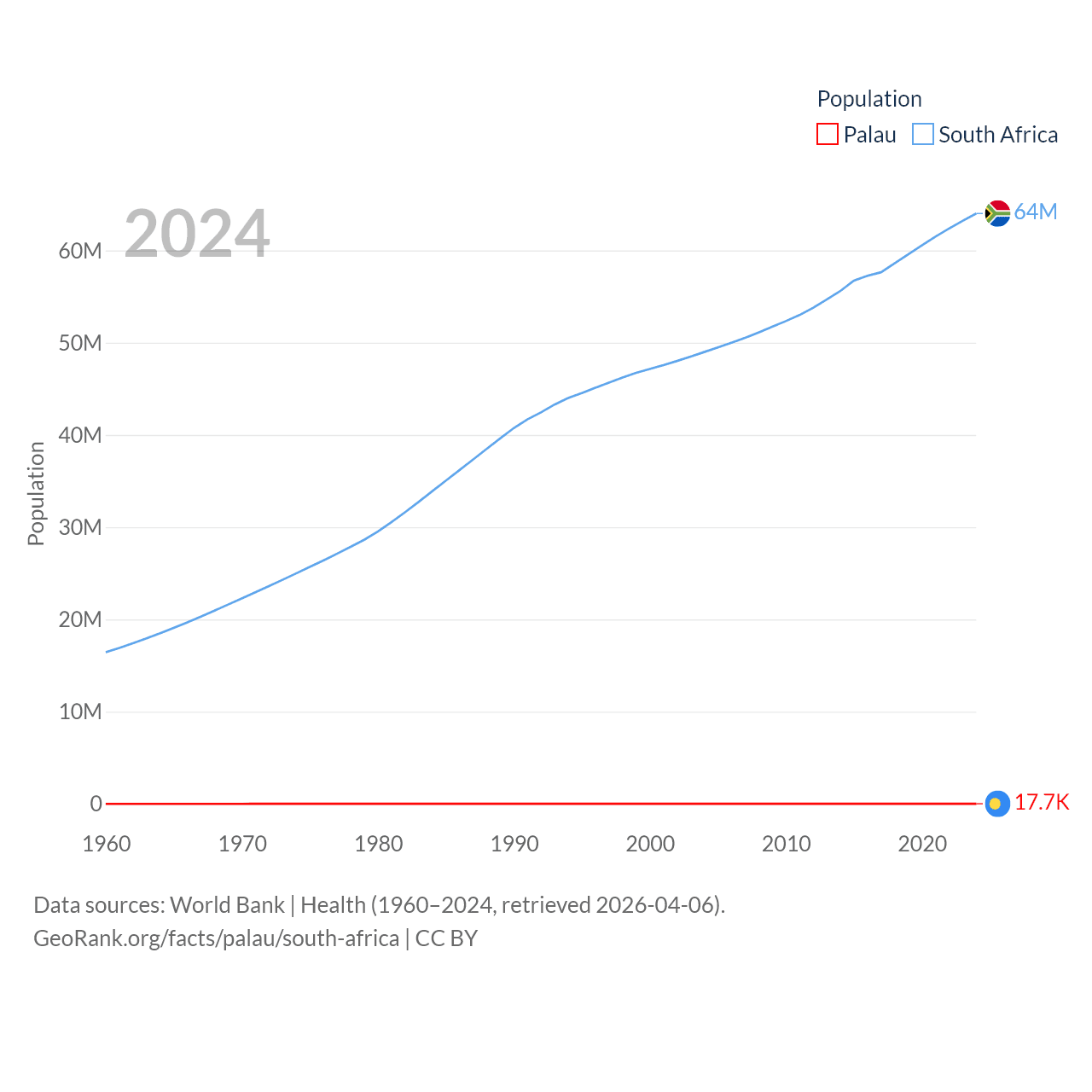 Palau has a population of 17.7K (ranked 194/197), compared with 64M in South Africa (ranked 24/197). Palau's land area is 177.6 sq mi versus 468,377 sq mi for South Africa (ranked 180th vs. 24th).