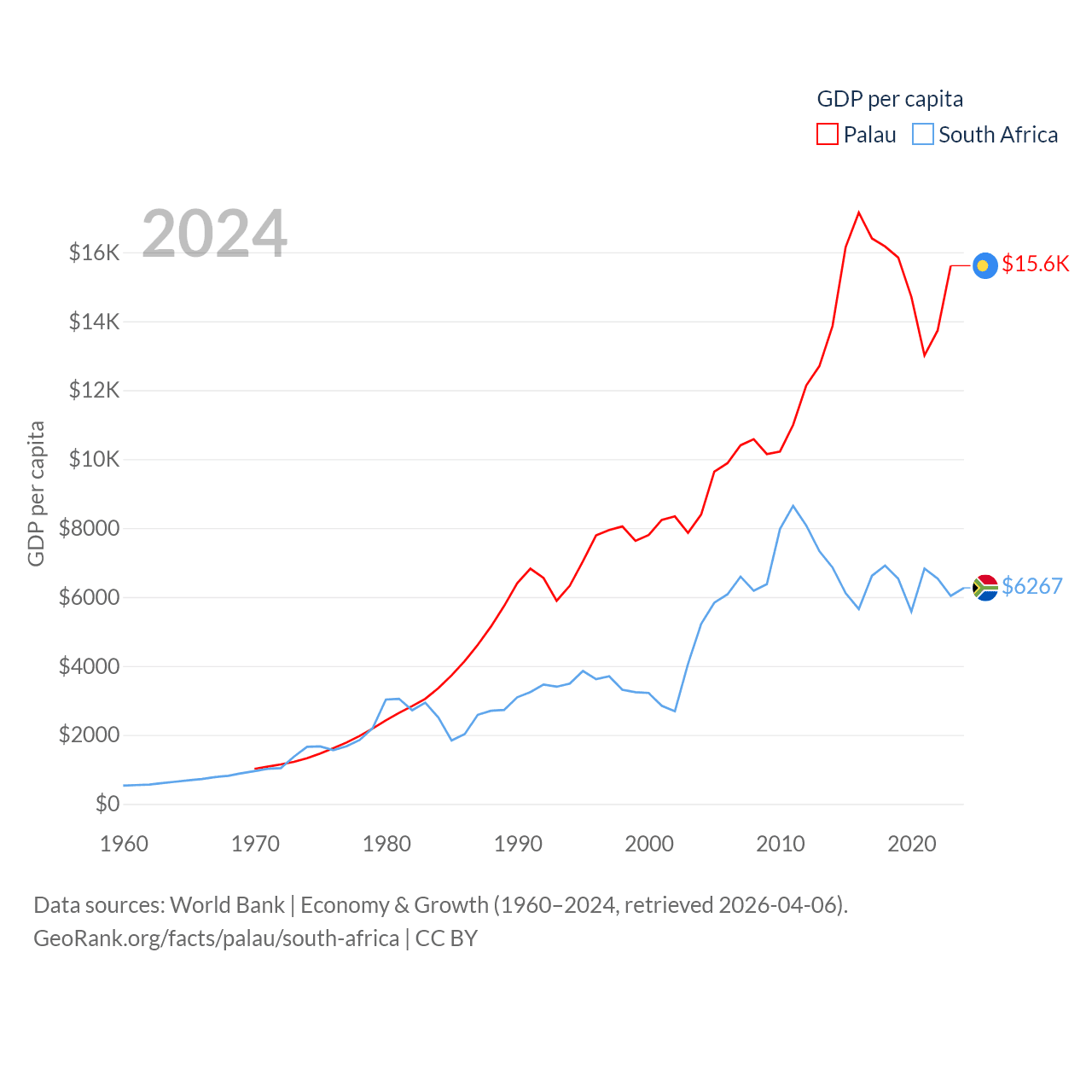 By GDP, Palau ranks 194/197 ($277M) and South Africa ranks 40/197 ($401B). By GDP per capita, Palau ranks 67/197 ($15,611), while South Africa ranks 111/197 ($6,267).