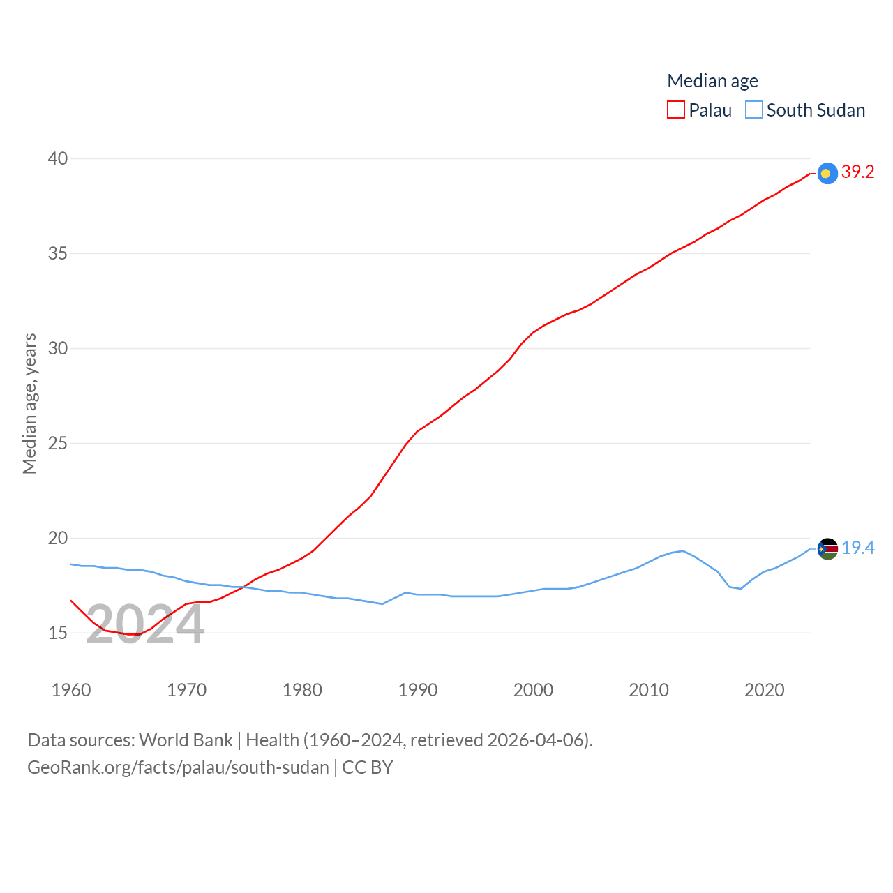 Palau has a population of 17.7K (ranked 194/197), compared with 11.9M in South Sudan (ranked 81/197). Palau's land area is 177.6 sq mi versus 243,990 sq mi for South Sudan (ranked 180th vs. 41st).
