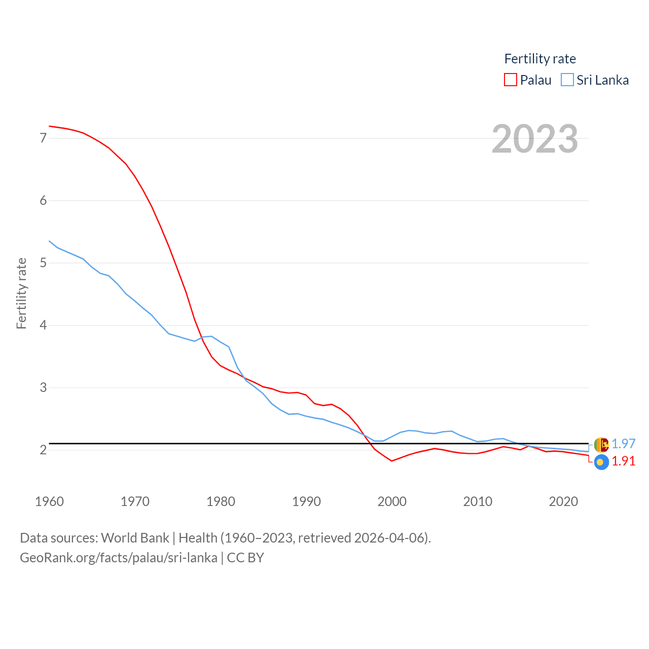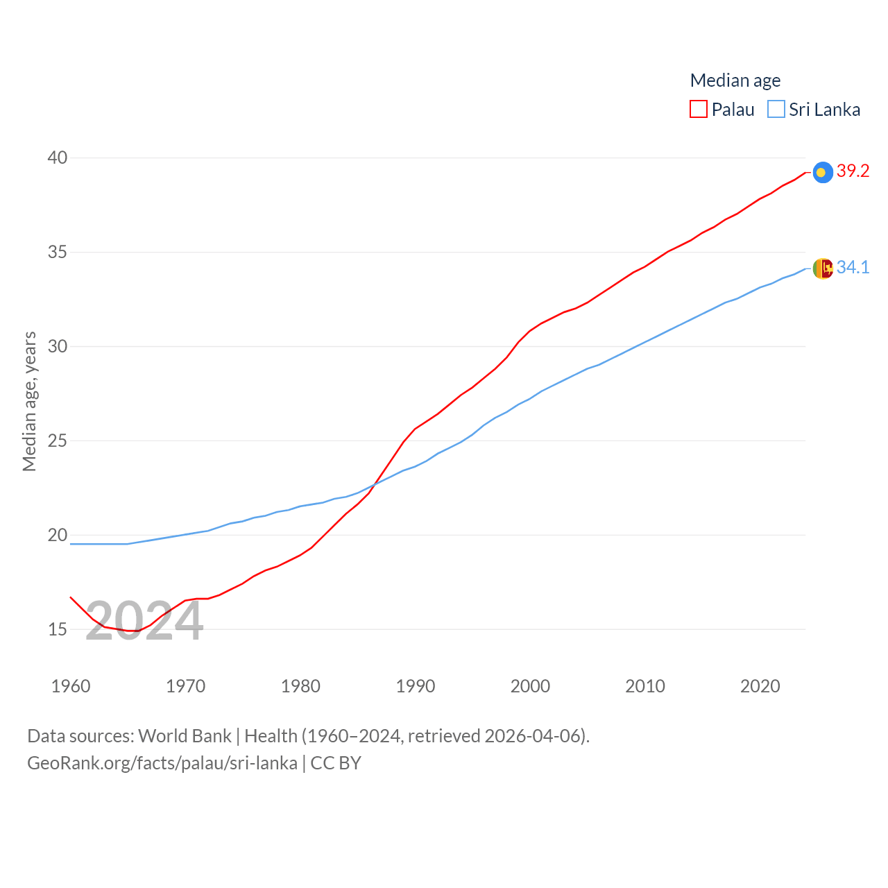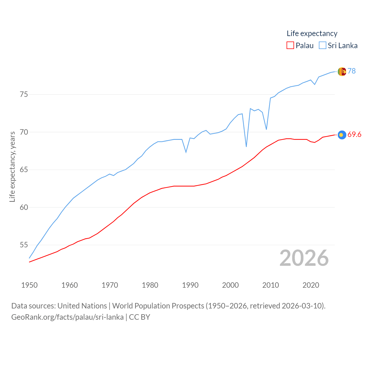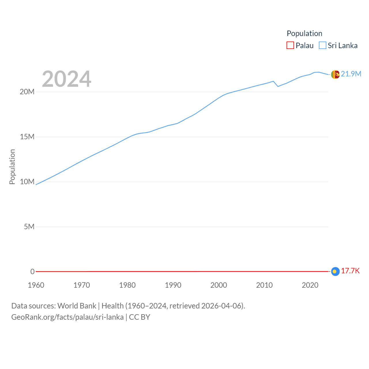Palau has a population of 17.7K (ranked 194/197), compared with 21.9M in Sri Lanka (ranked 61/197). Palau's land area is 177.6 sq mi versus 23,884 sq mi for Sri Lanka (ranked 180th vs. 122nd).