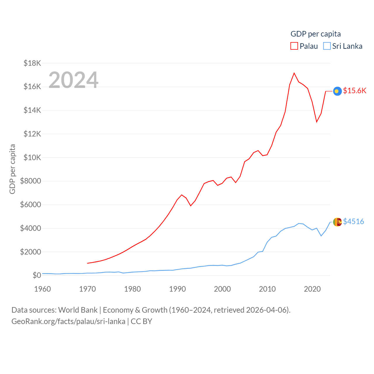 By GDP, Palau ranks 194/197 ($277M) and Sri Lanka ranks 72/197 ($99B). By GDP per capita, Palau ranks 67/197 ($15,611), while Sri Lanka ranks 124/197 ($4,516).