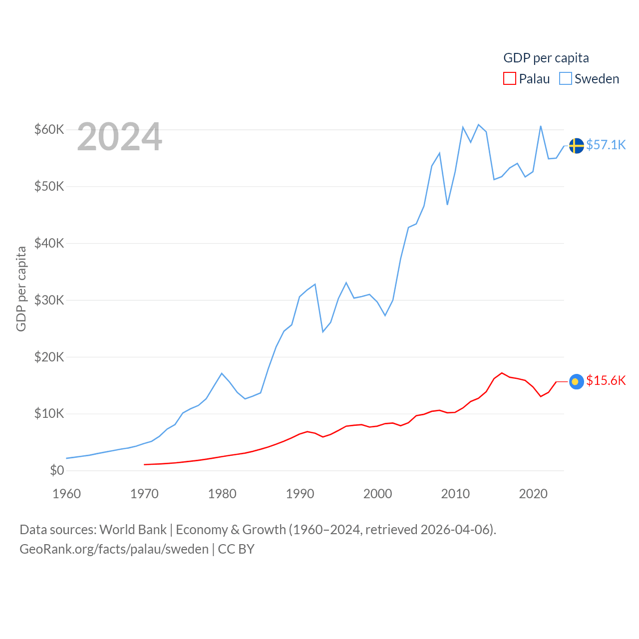 By GDP, Palau ranks 194/197 ($277M) and Sweden ranks 26/197 ($604B). By GDP per capita, Palau ranks 67/197 ($15,611), while Sweden ranks 17/197 ($57,117).