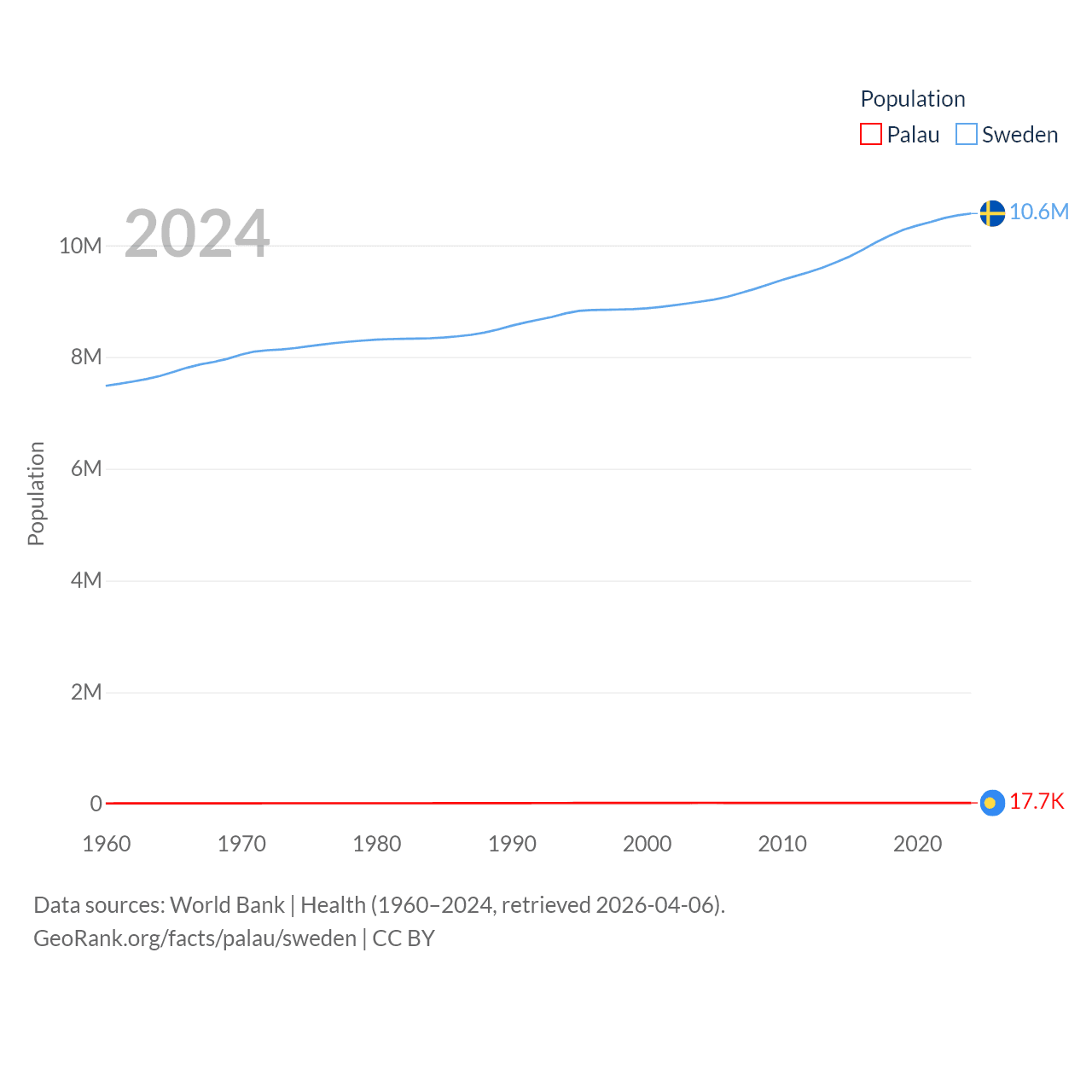 Palau has a population of 17.7K (ranked 194/197), compared with 10.6M in Sweden (ranked 93/197). Palau's land area is 177.6 sq mi versus 157,248 sq mi for Sweden (ranked 180th vs. 58th).