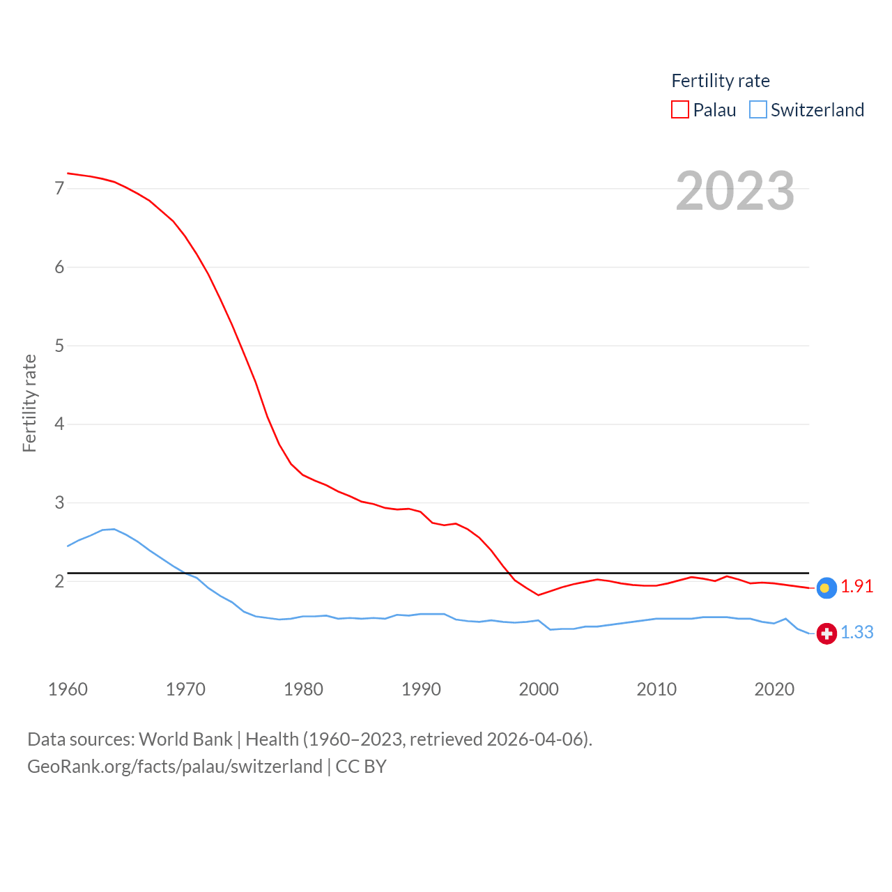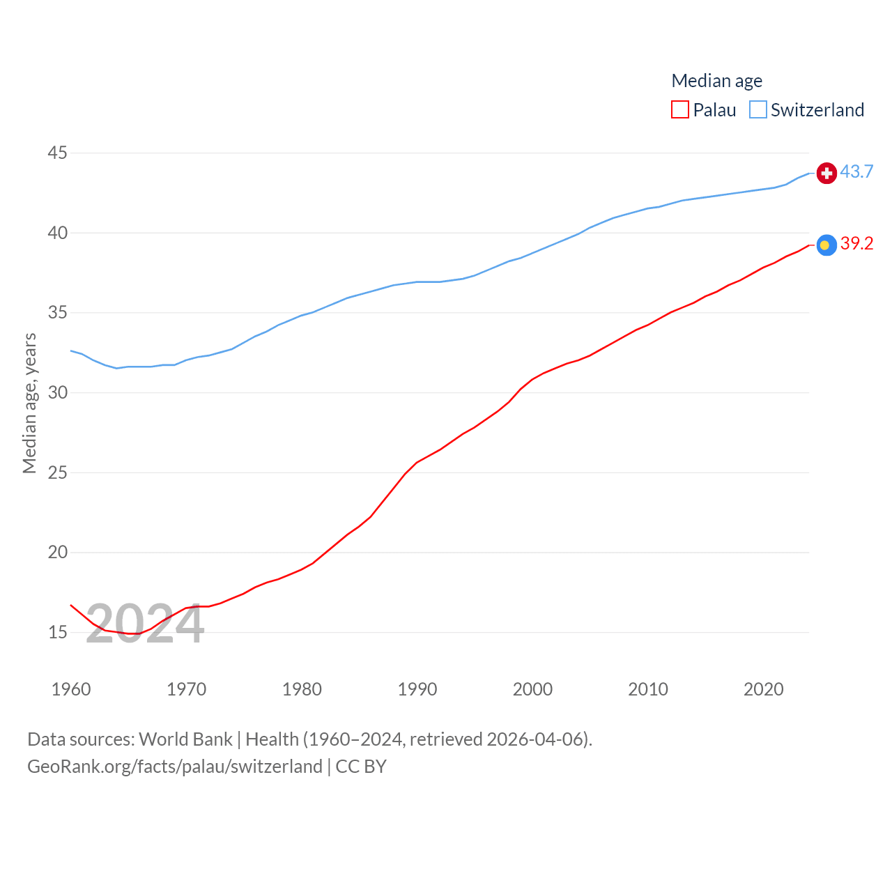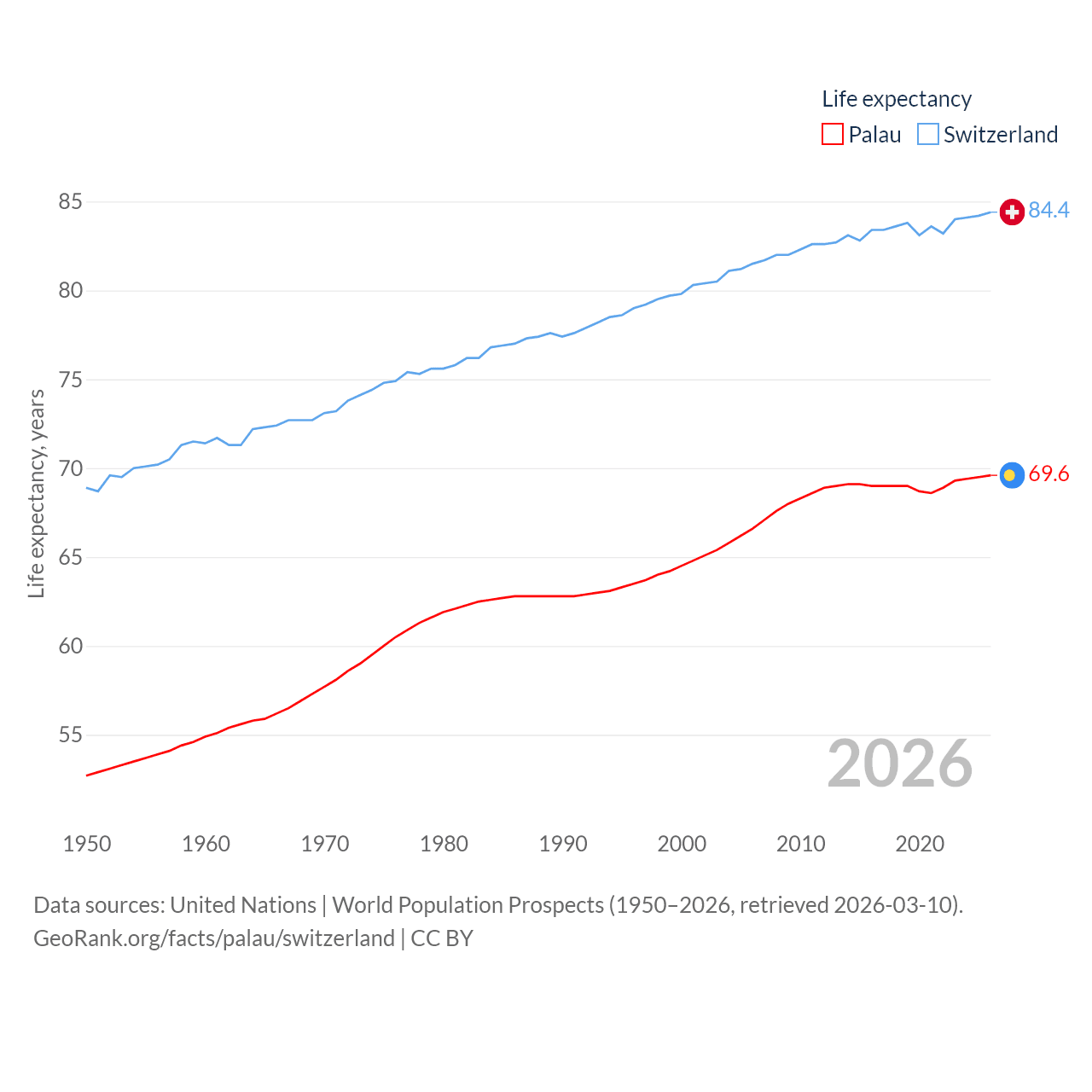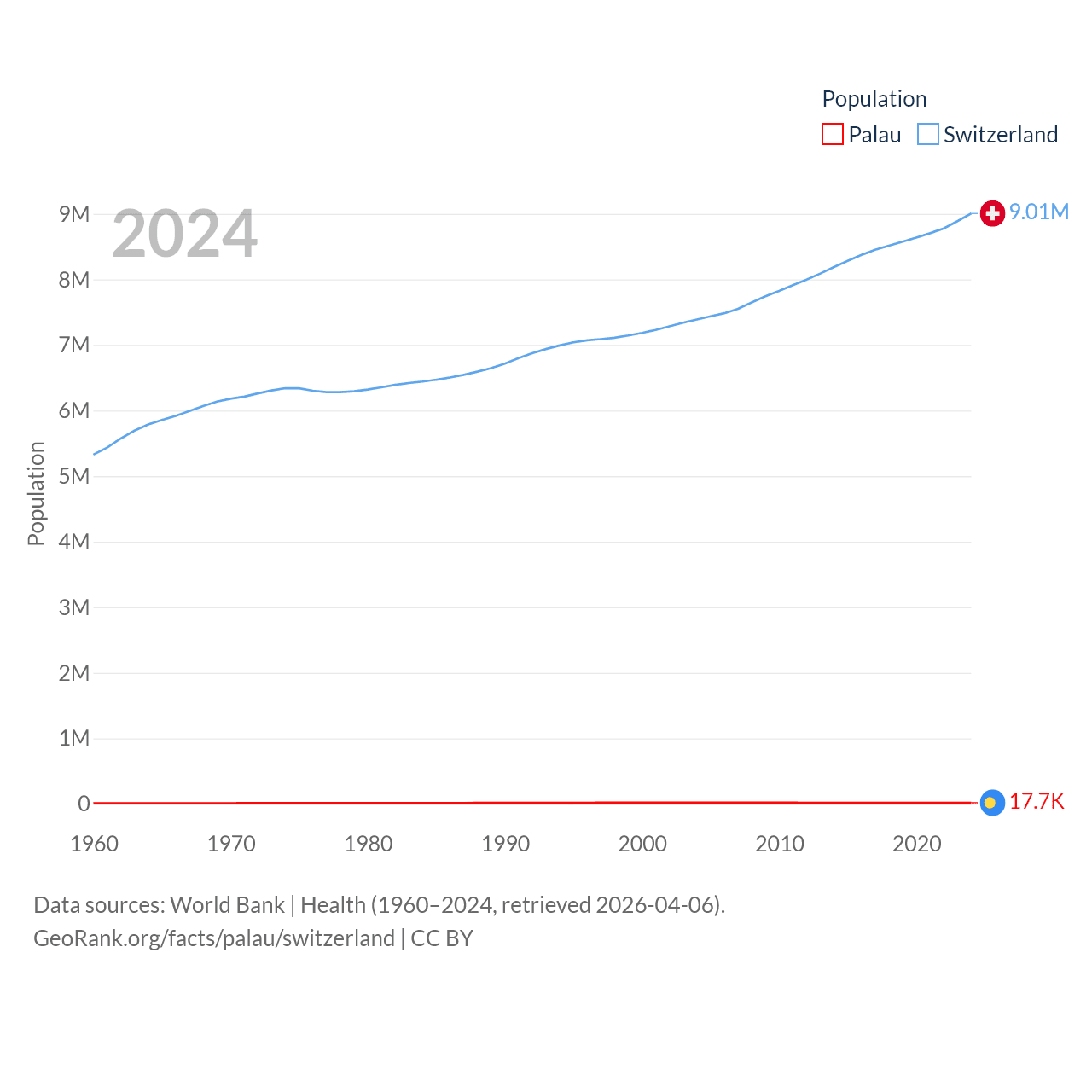 Palau has a population of 17.7K (ranked 194/197), compared with 9.01M in Switzerland (ranked 101/197). Palau's land area is 177.6 sq mi versus 15,255 sq mi for Switzerland (ranked 180th vs. 131st).