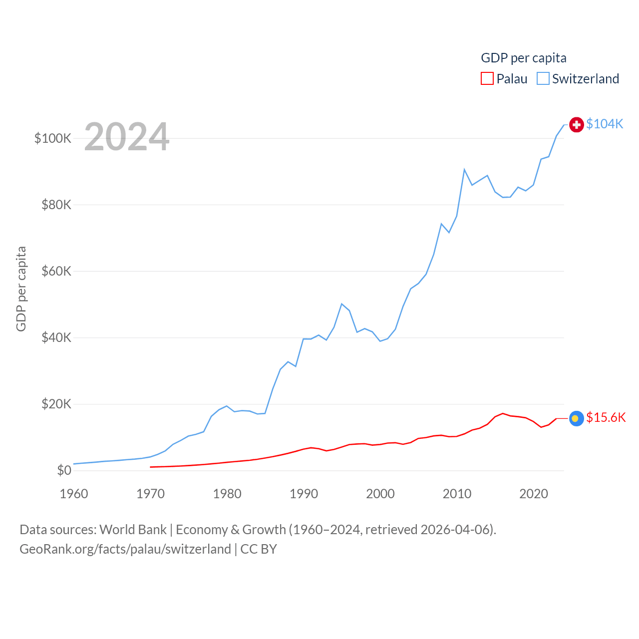 By GDP, Palau ranks 194/197 ($277M) and Switzerland ranks 20/197 ($937B). By GDP per capita, Palau ranks 67/197 ($15,611), while Switzerland ranks 5/197 ($103,998).