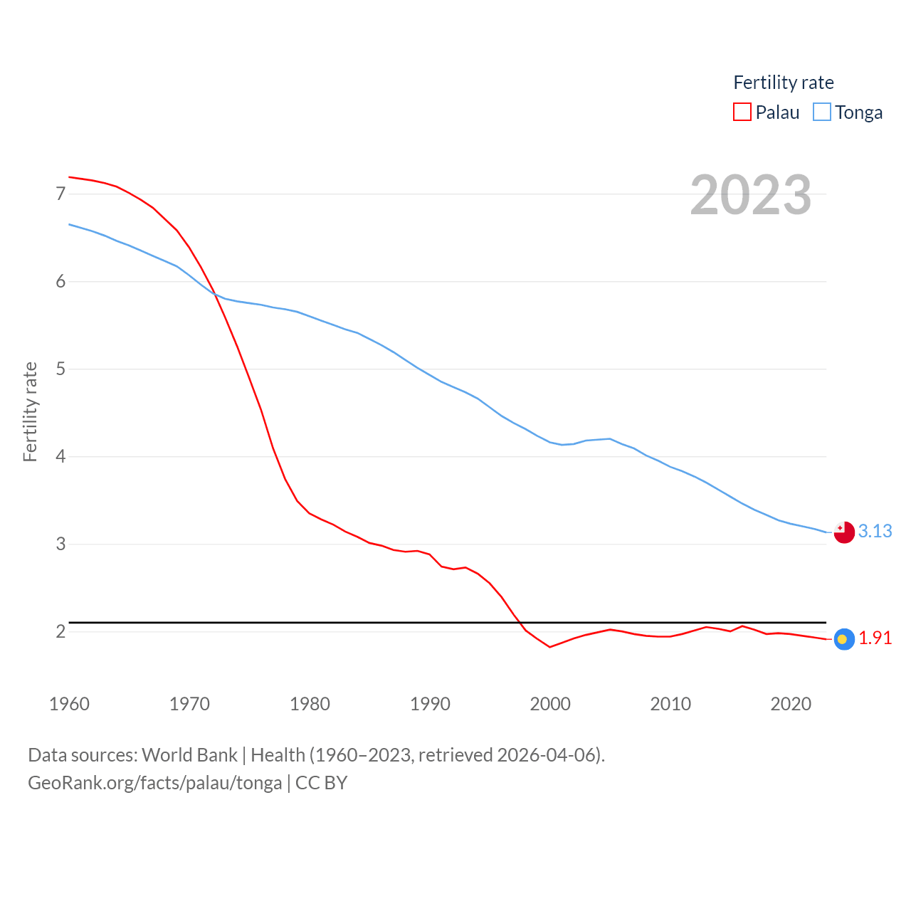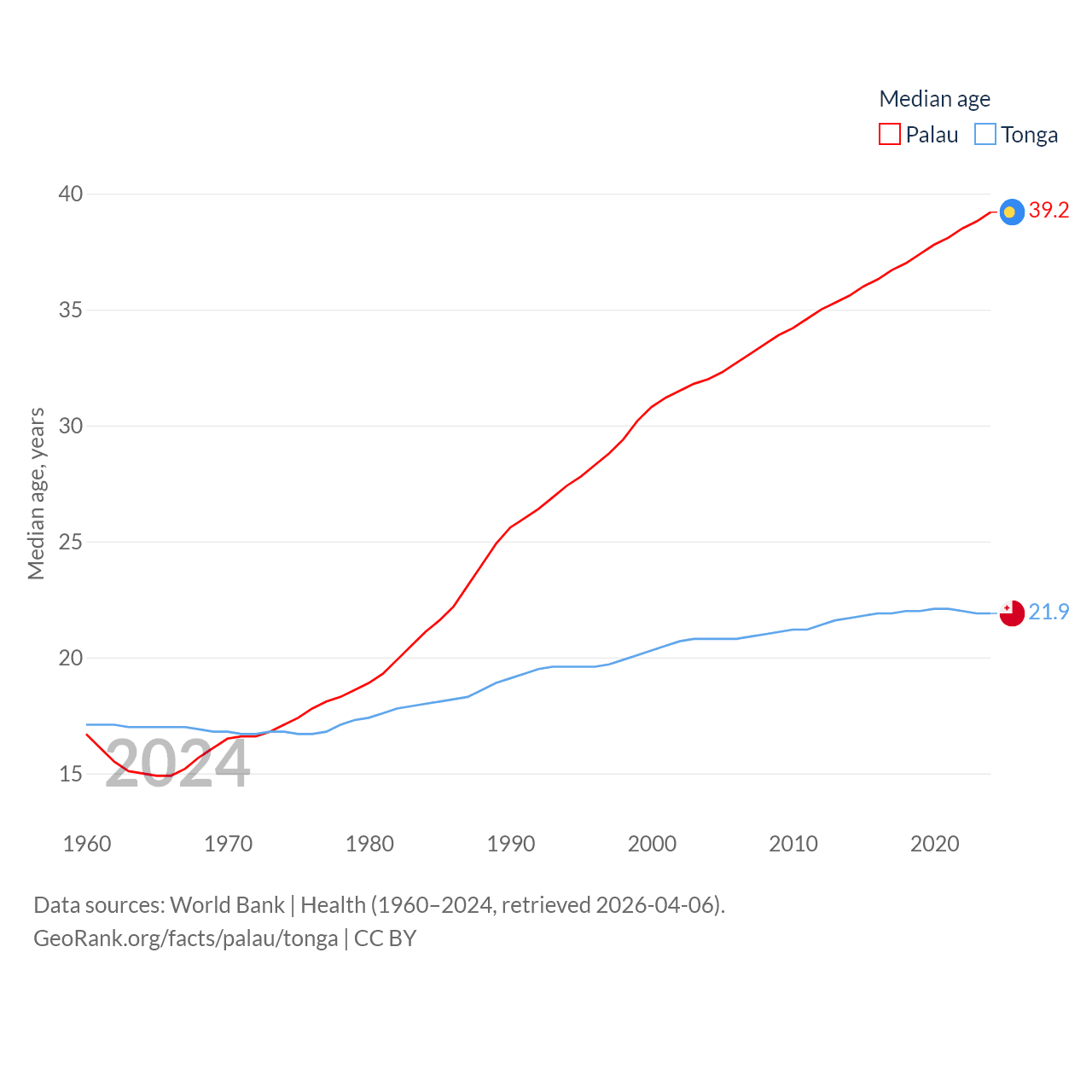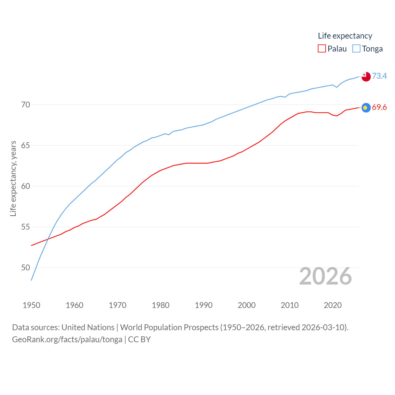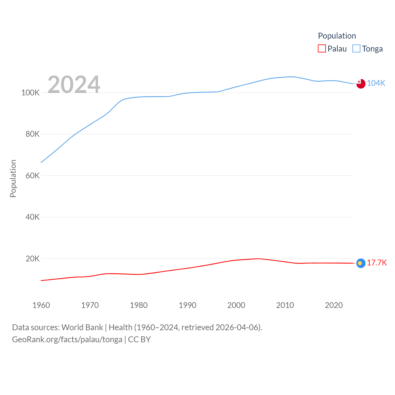 Palau has a population of 17.7K (ranked 194/197), compared with 104K in Tonga (ranked 183/197). Palau's land area is 177.6 sq mi versus 278 sq mi for Tonga (ranked 180th vs. 176th).
