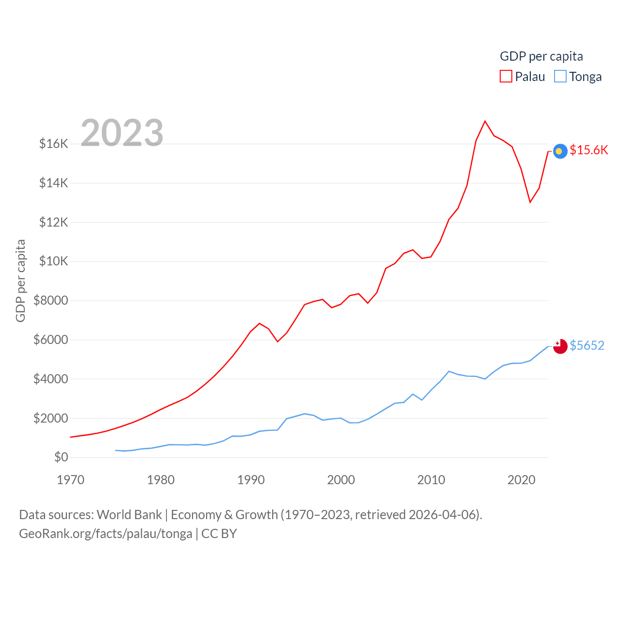 By GDP, Palau ranks 194/197 ($277M) and Tonga ranks 191/197 ($591M). By GDP per capita, Palau ranks 67/197 ($15,611), while Tonga ranks 115/197 ($5,652).