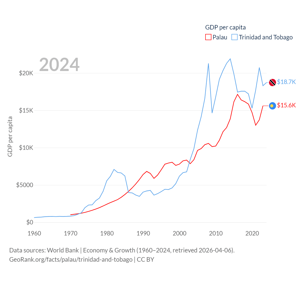 By GDP, Palau ranks 194/197 ($277M) and Trinidad and Tobago ranks 115/197 ($25.6B). By GDP per capita, Palau ranks 67/197 ($15,611), while Trinidad and Tobago ranks 61/197 ($18,733).
