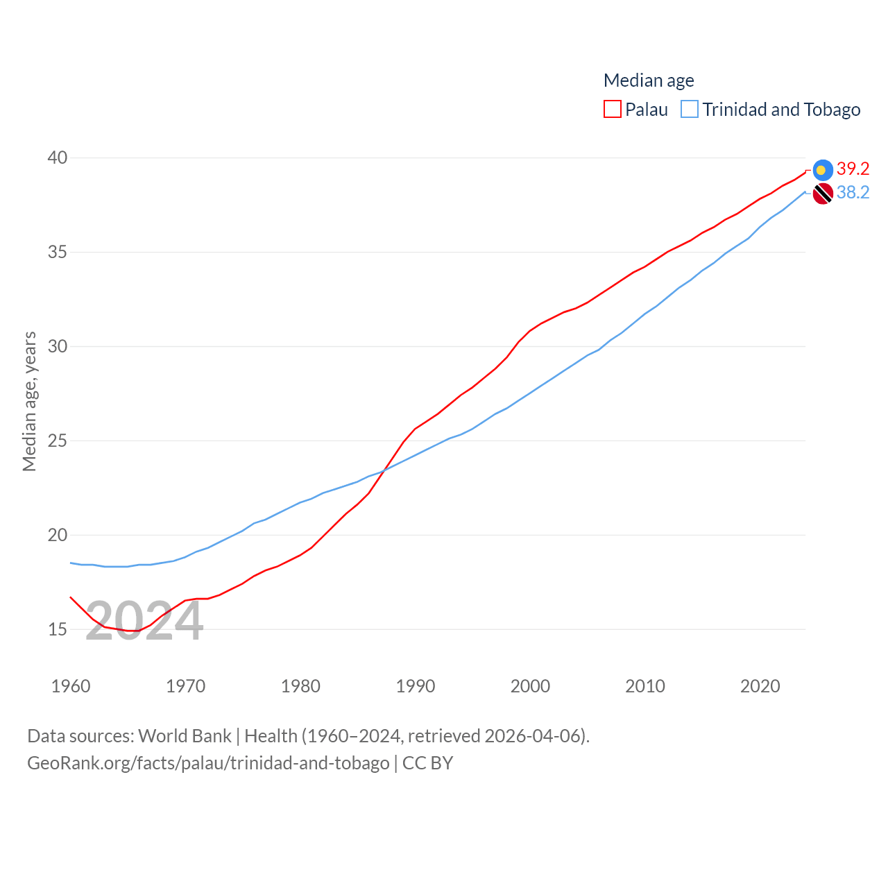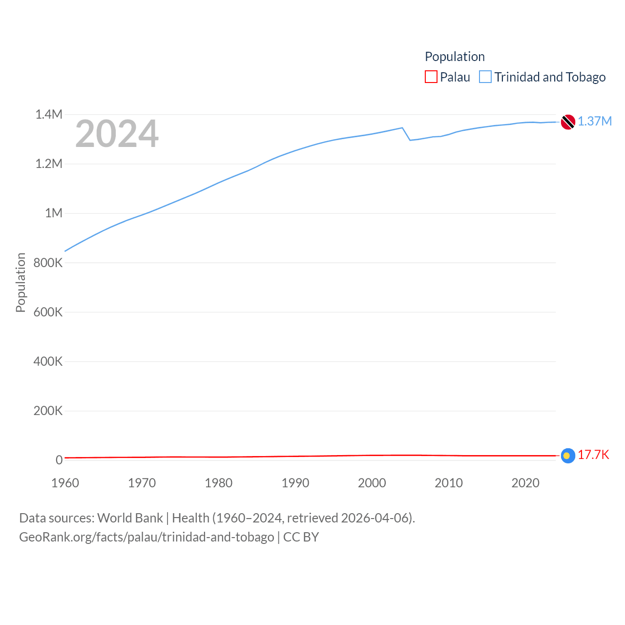 Palau has a population of 17.7K (ranked 194/197), compared with 1.37M in Trinidad and Tobago (ranked 154/197). Palau's land area is 177.6 sq mi versus 1,981 sq mi for Trinidad and Tobago (ranked 180th vs. 166th).