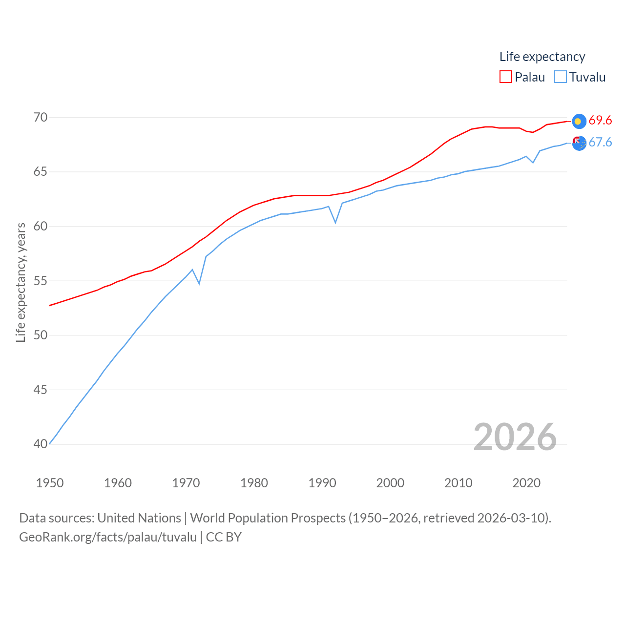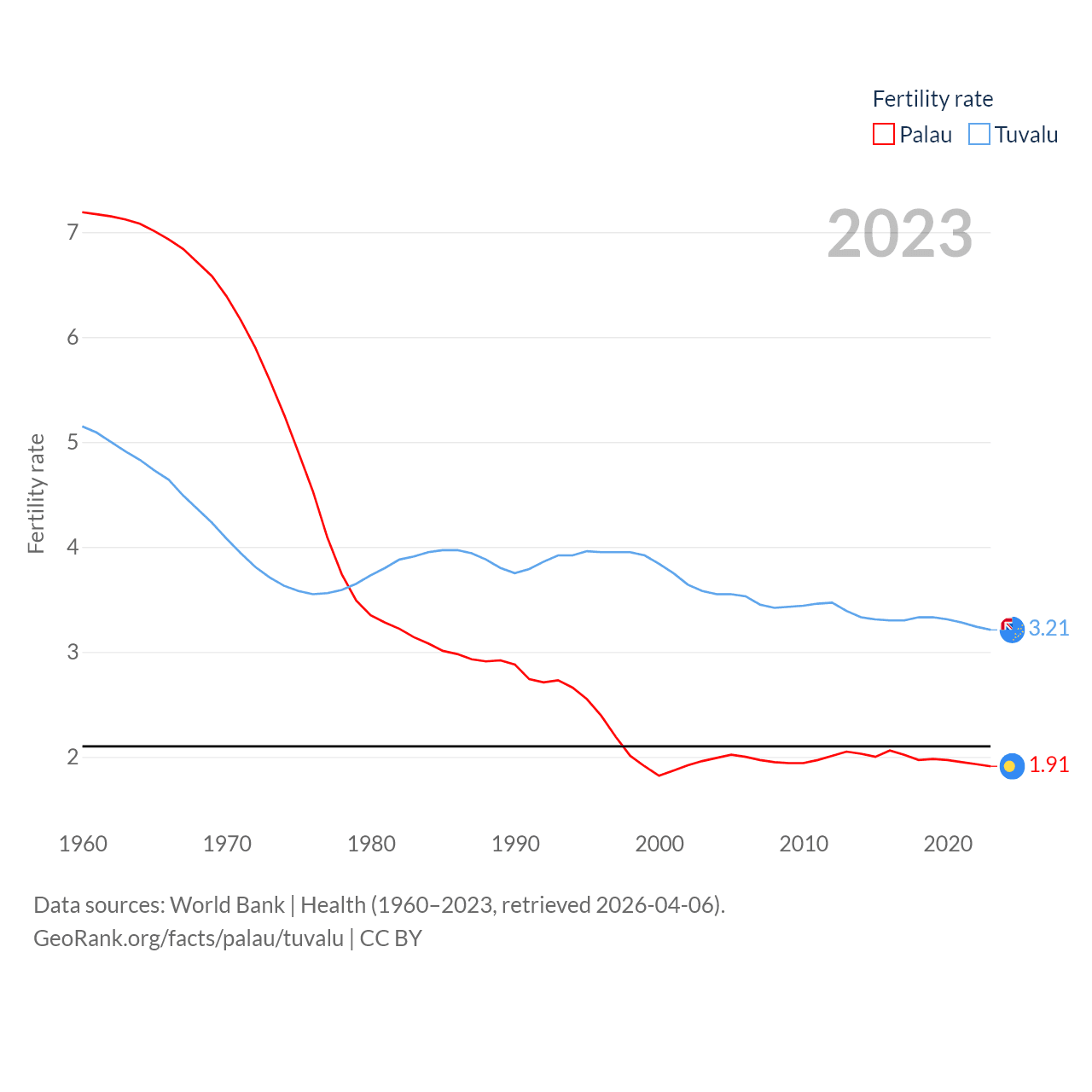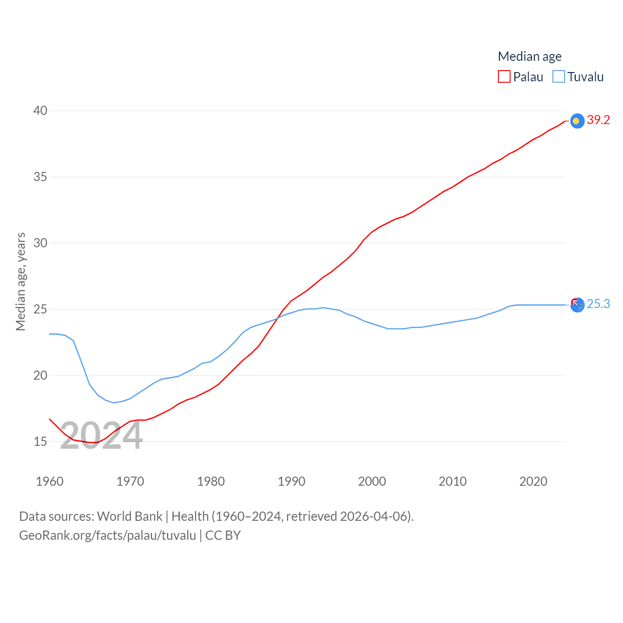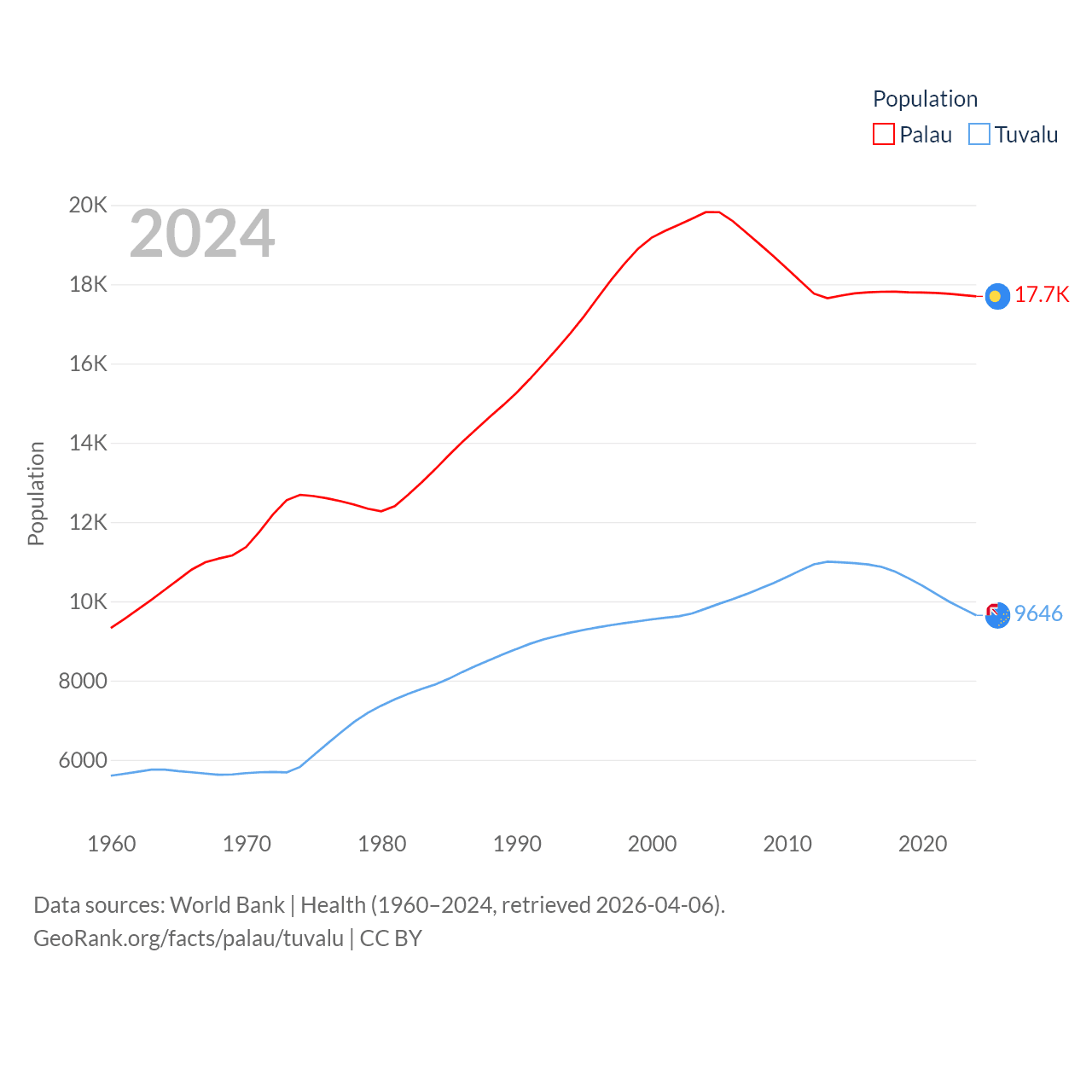 Palau has a population of 17.7K (ranked 194/197), compared with 9.65K in Tuvalu (ranked 196/197). Palau's land area is 177.6 sq mi versus 11.6 sq mi for Tuvalu (ranked 180th vs. 194th).