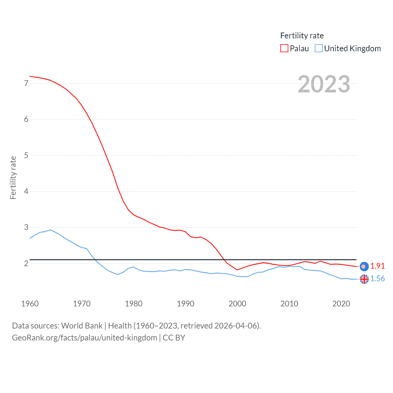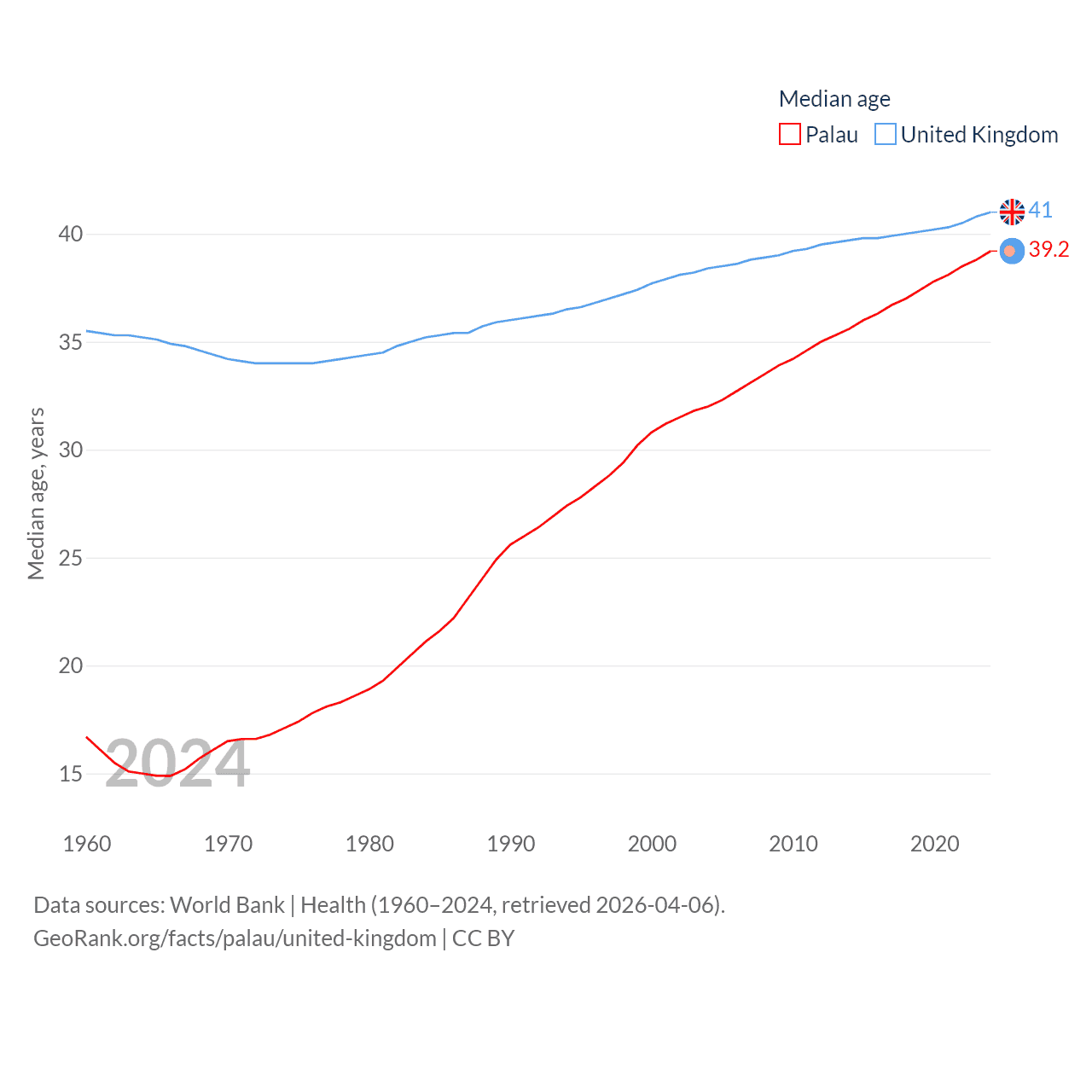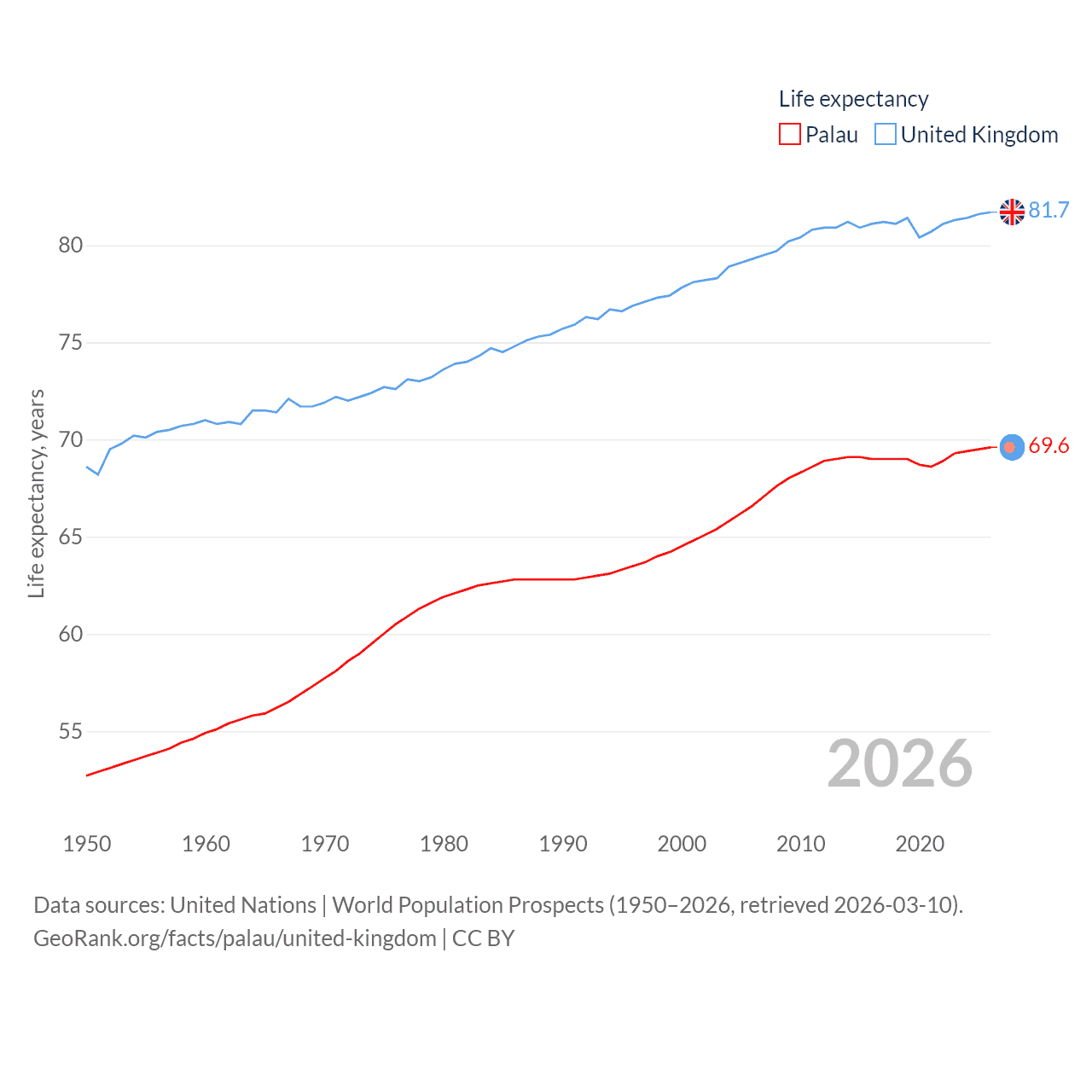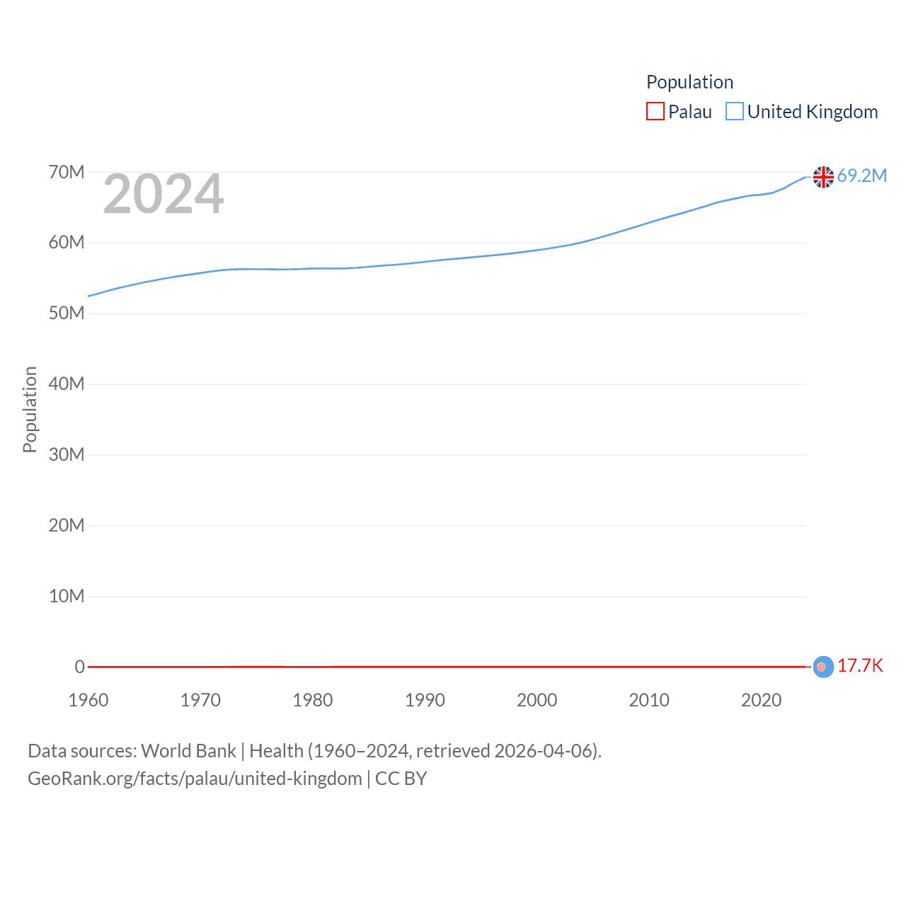 Palau has a population of 17.7K (ranked 194/197), compared with 69.2M in The United Kingdom (ranked 21/197). Palau's land area is 177.6 sq mi versus 93,410 sq mi for The United Kingdom (ranked 180th vs. 78th).