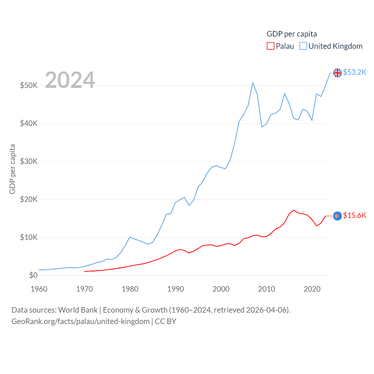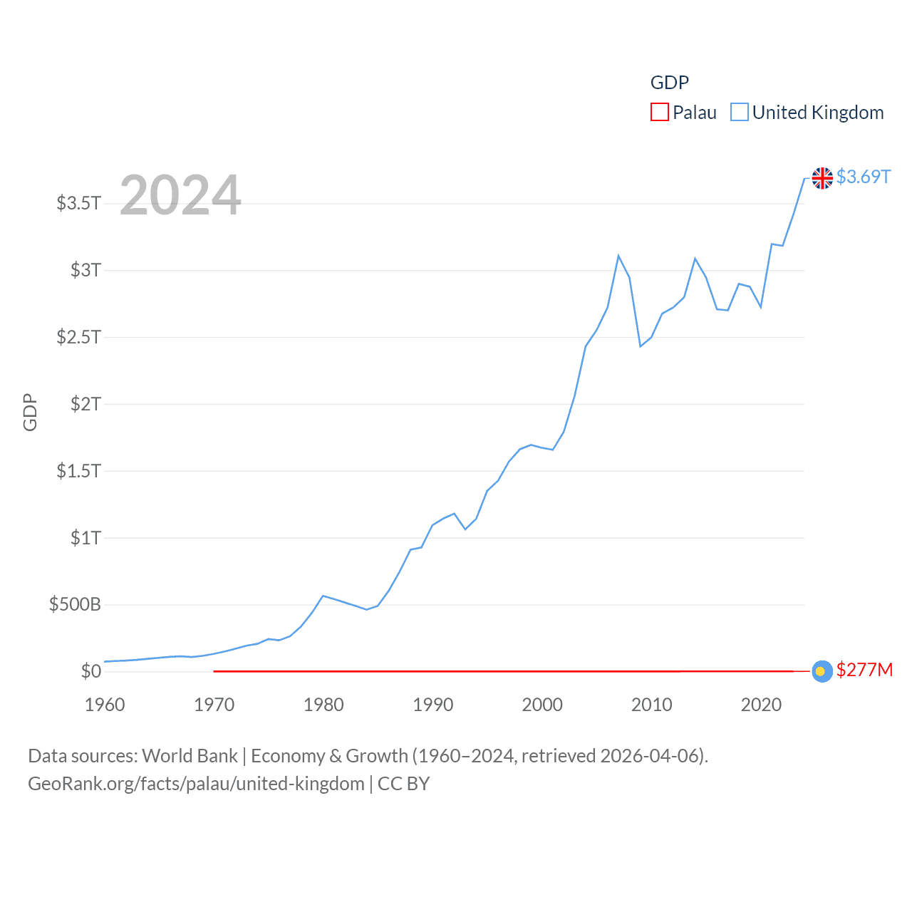 By GDP, Palau ranks 194/197 ($277M) and The United Kingdom ranks 6/197 ($3.69T). By GDP per capita, Palau ranks 67/197 ($15,611), while The United Kingdom ranks 22/197 ($53,246).