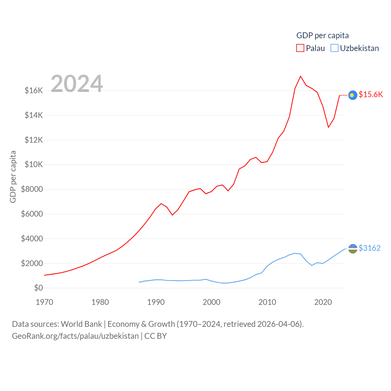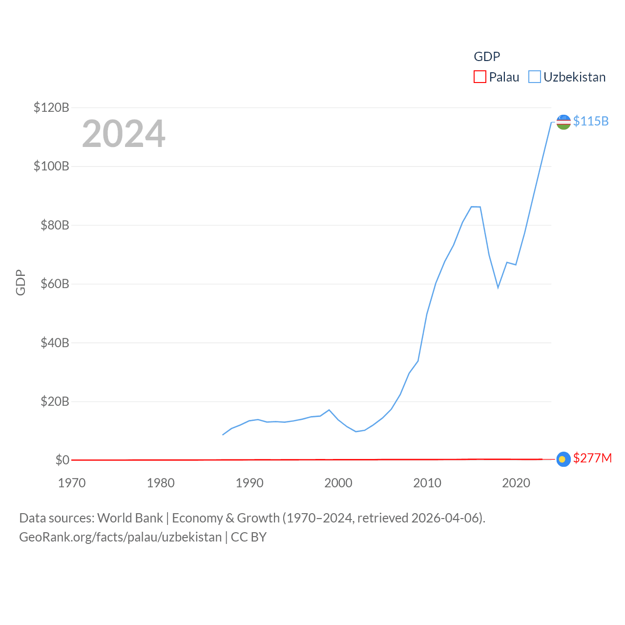 By GDP, Palau ranks 194/197 ($277M) and Uzbekistan ranks 66/197 ($115B). By GDP per capita, Palau ranks 67/197 ($15,611), while Uzbekistan ranks 139/197 ($3,162).