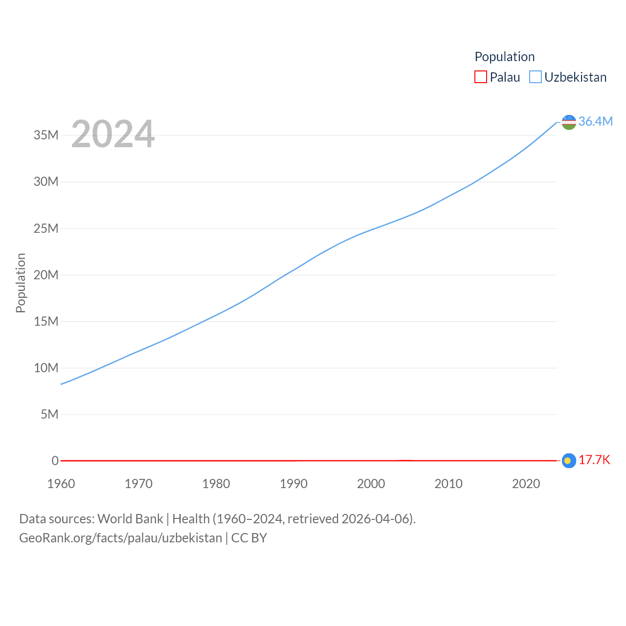 Palau has a population of 17.7K (ranked 194/197), compared with 36.4M in Uzbekistan (ranked 43/197). Palau's land area is 177.6 sq mi versus 170,136 sq mi for Uzbekistan (ranked 180th vs. 56th).