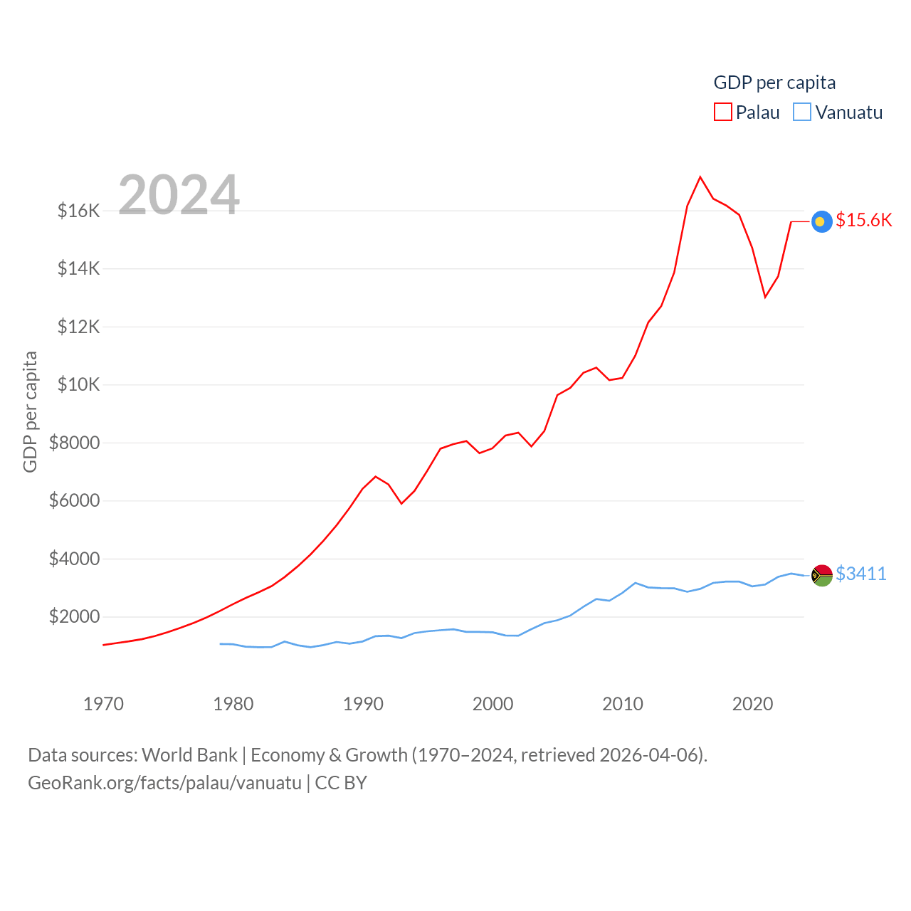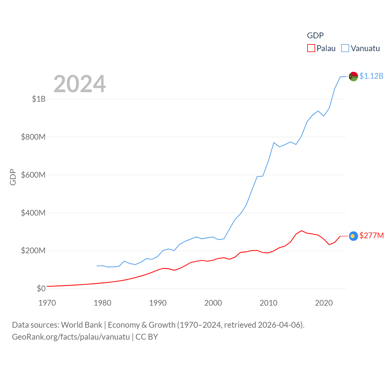 By GDP, Palau ranks 194/197 ($277M) and Vanuatu ranks 188/197 ($1.12B). By GDP per capita, Palau ranks 67/197 ($15,611), while Vanuatu ranks 137/197 ($3,411).