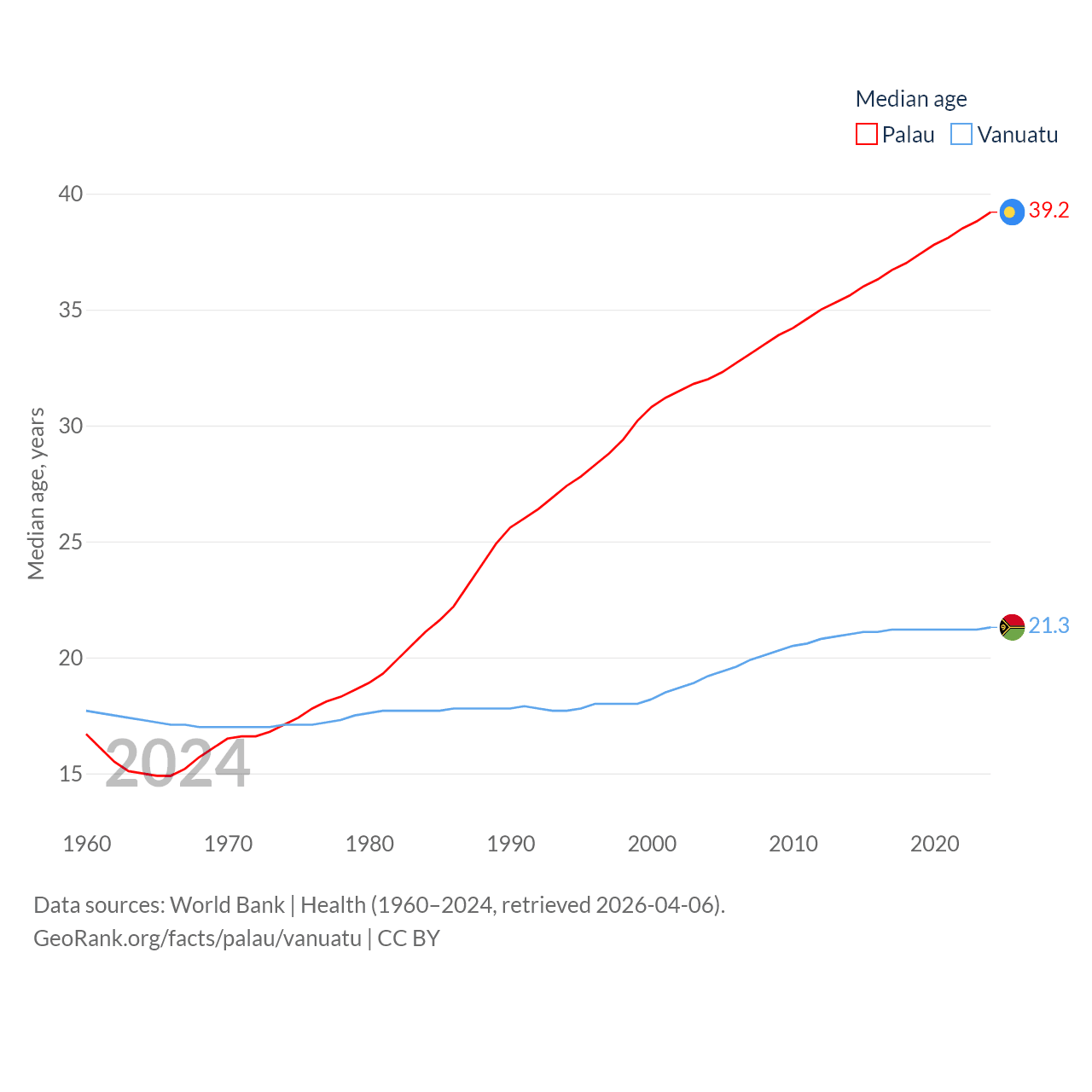 Palau has a population of 17.7K (ranked 194/197), compared with 328K in Vanuatu (ranked 174/197). Palau's land area is 177.6 sq mi versus 4,707 sq mi for Vanuatu (ranked 180th vs. 157th).