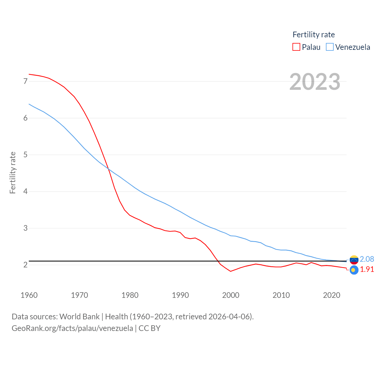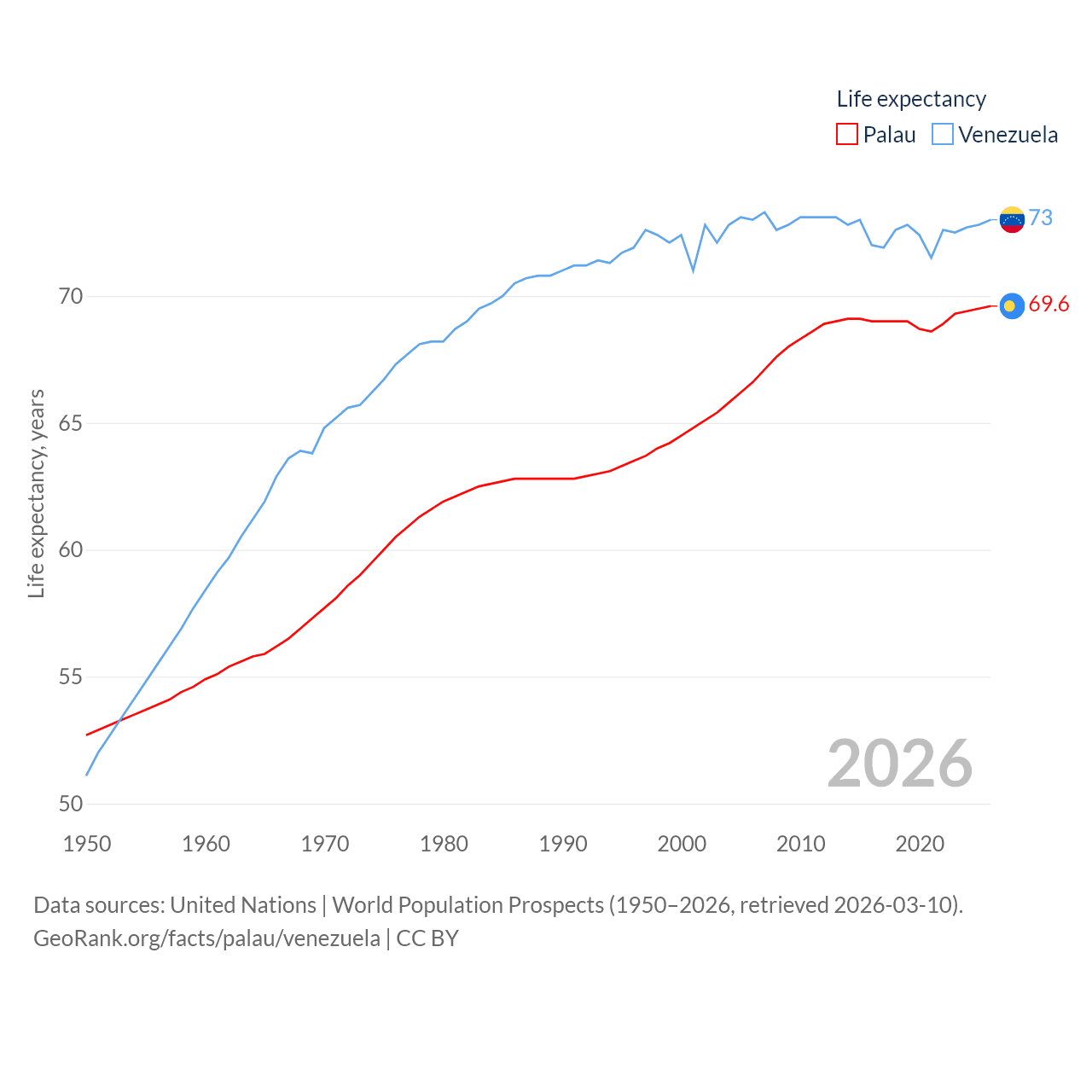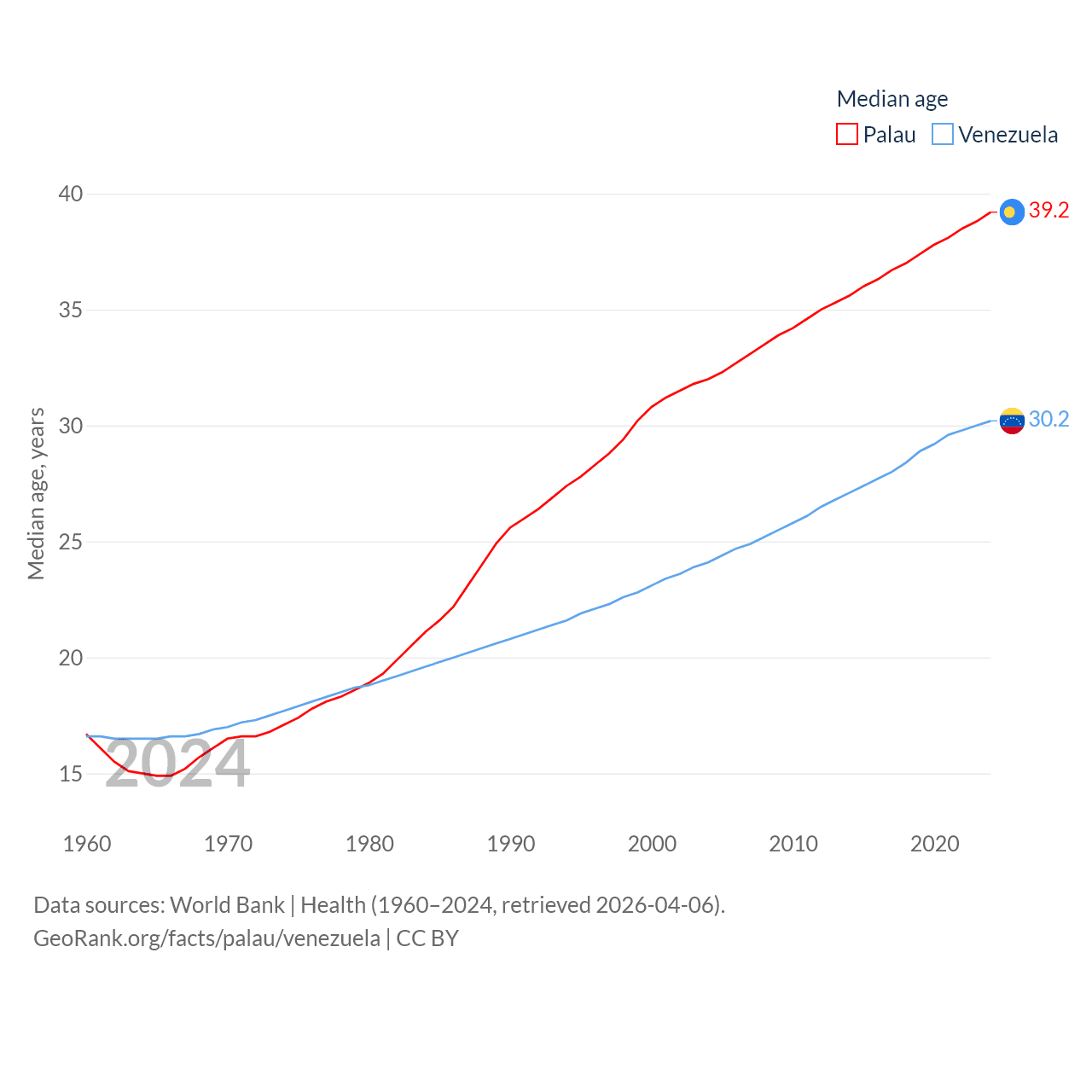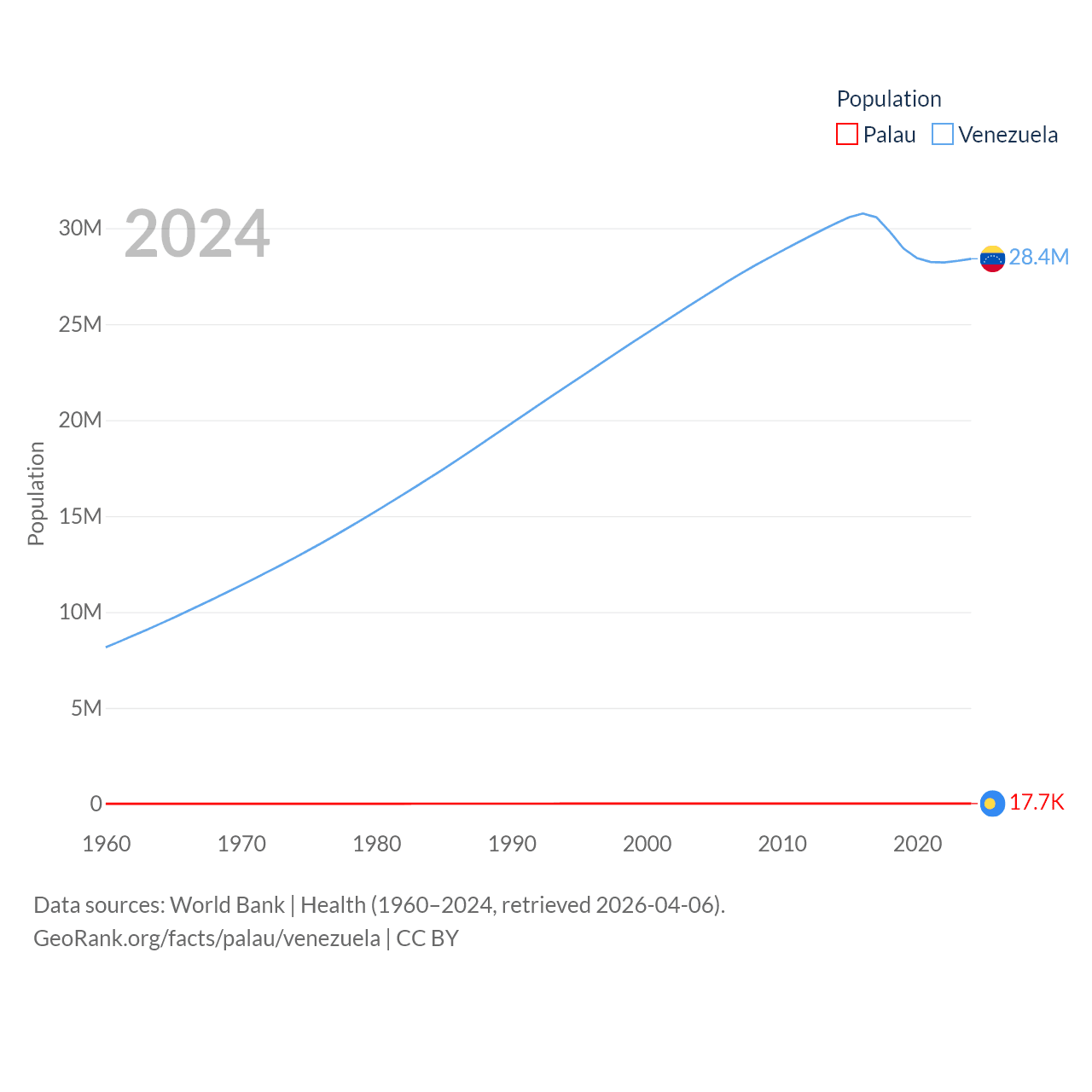 Palau has a population of 17.7K (ranked 194/197), compared with 28.4M in Venezuela (ranked 53/197). Palau's land area is 177.6 sq mi versus 340,561 sq mi for Venezuela (ranked 180th vs. 32nd).