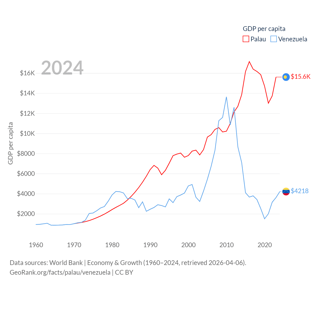 By GDP, Palau ranks 194/197 ($277M) and Venezuela ranks 65/197 ($120B). By GDP per capita, Palau ranks 67/197 ($15,611), while Venezuela ranks 128/197 ($4,218).