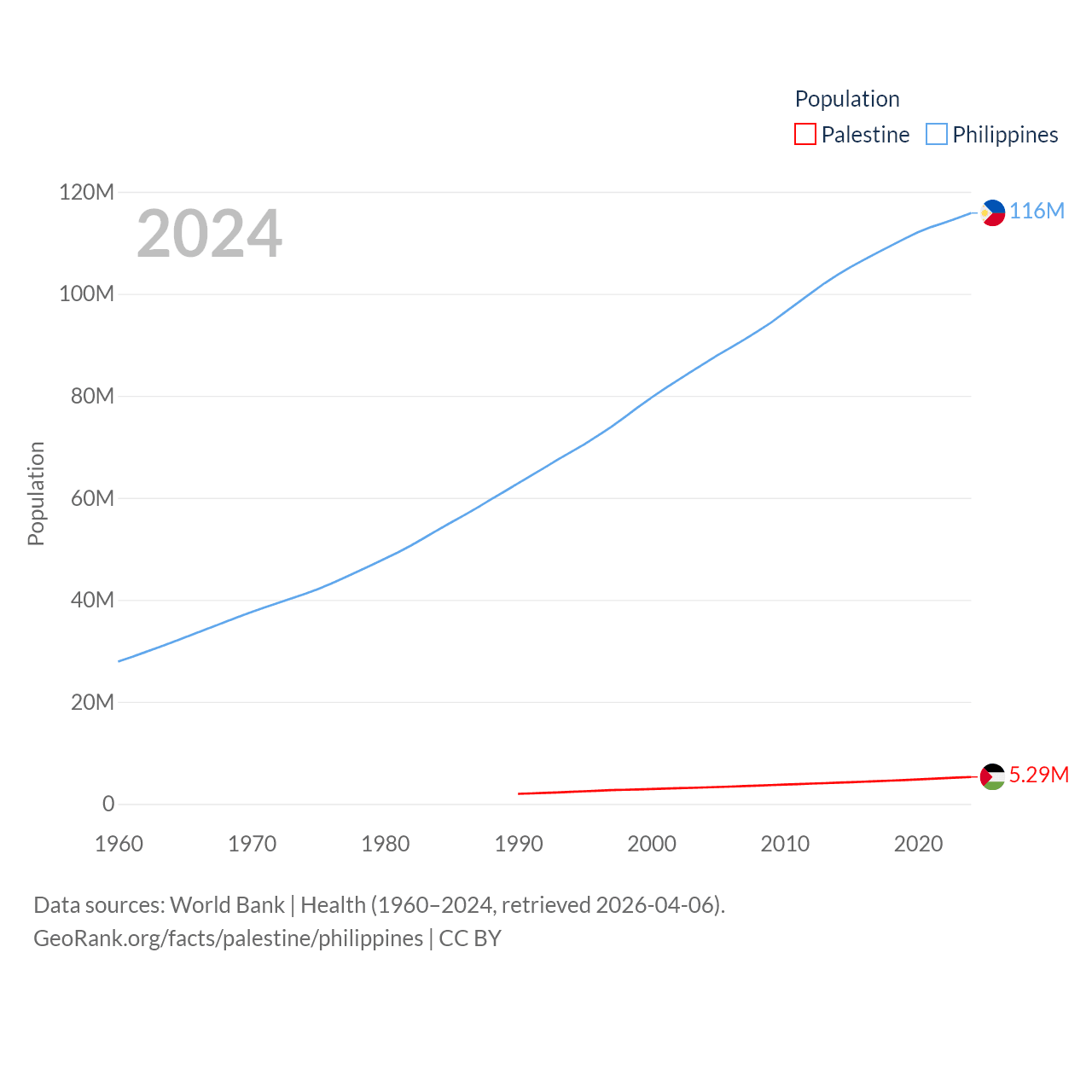 Palestine has a population of 5.29M (ranked 122/197), compared with 116M in The Philippines (ranked 14/197). Palestine's land area is 2,326 sq mi versus 115,124 sq mi for The Philippines (ranked 164th vs. 71st).