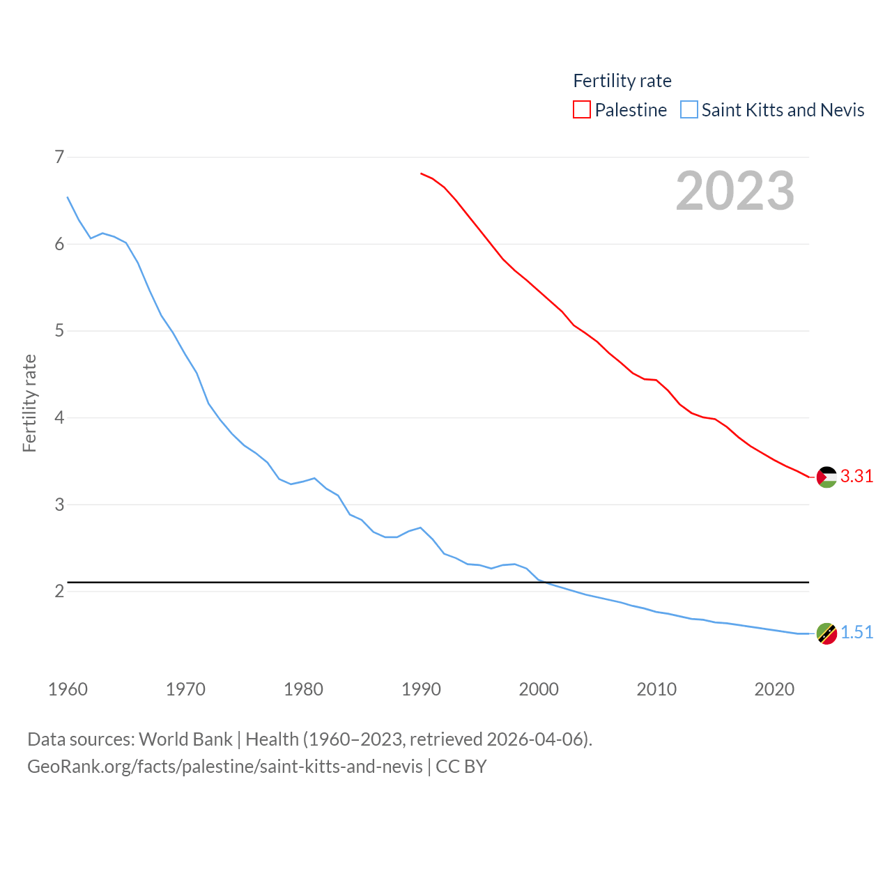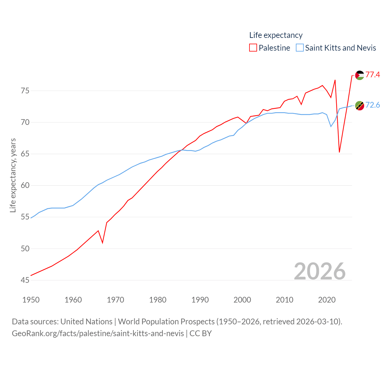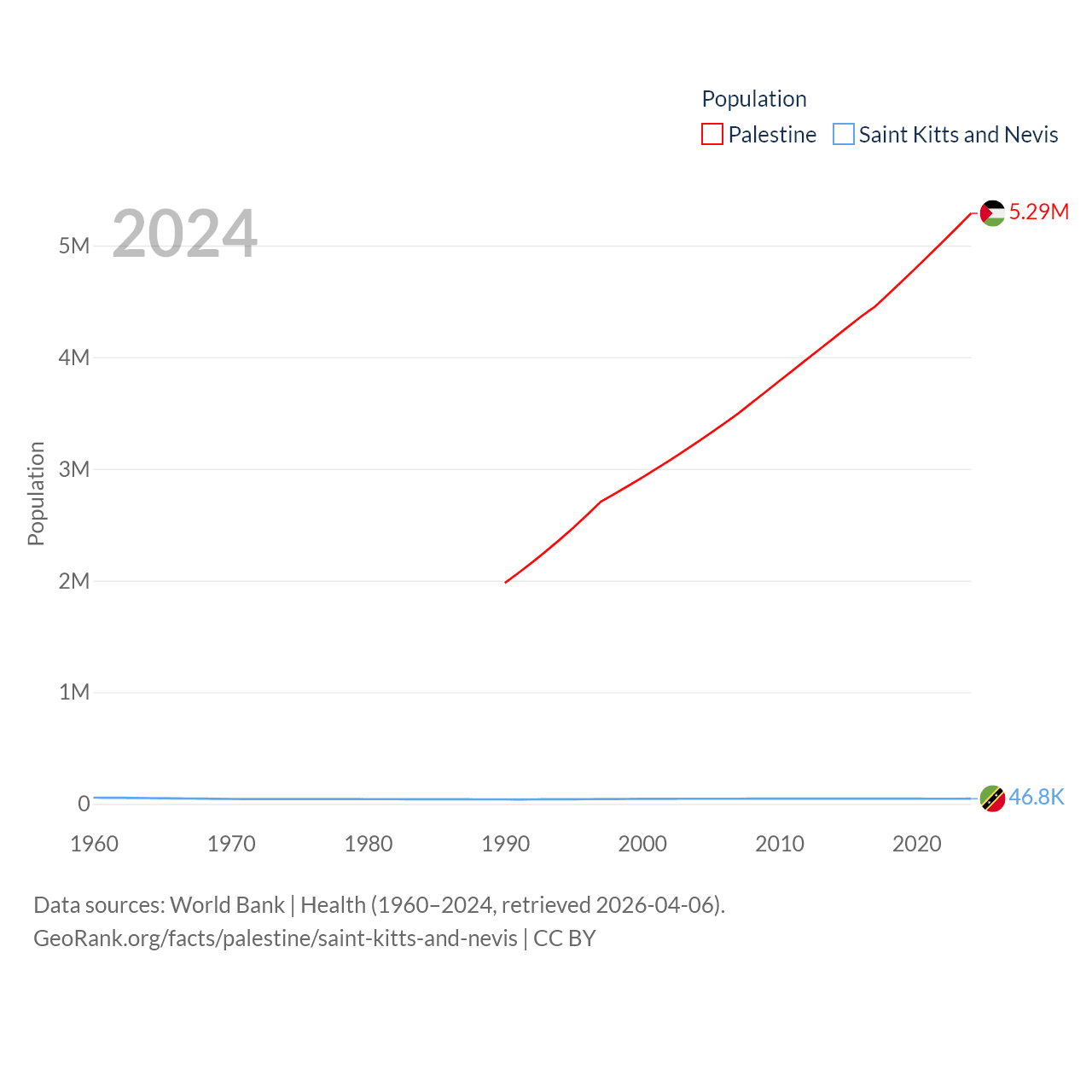 Palestine has a population of 5.29M (ranked 122/197), compared with 46.8K in Saint Kitts and Nevis (ranked 189/197). Palestine's land area is 2,326 sq mi versus 100.4 sq mi for Saint Kitts and Nevis (ranked 164th vs. 189th).