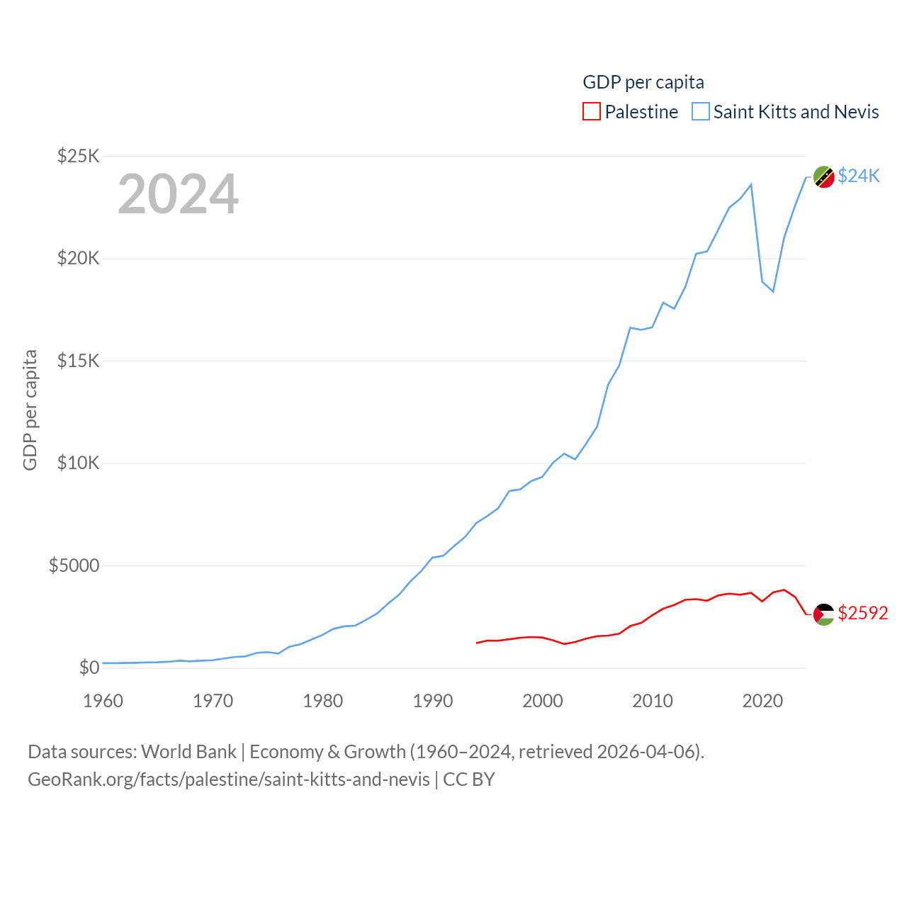 By GDP, Palestine ranks 146/197 ($13.7B) and Saint Kitts and Nevis ranks 187/197 ($1.12B). By GDP per capita, Palestine ranks 147/197 ($2,592), while Saint Kitts and Nevis ranks 51/197 ($23,961).