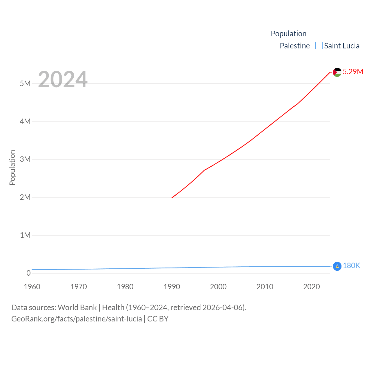 Palestine has a population of 5.29M (ranked 122/197), compared with 180K in Saint Lucia (ranked 178/197). Palestine's land area is 2,326 sq mi versus 235.5 sq mi for Saint Lucia (ranked 164th vs. 178th).