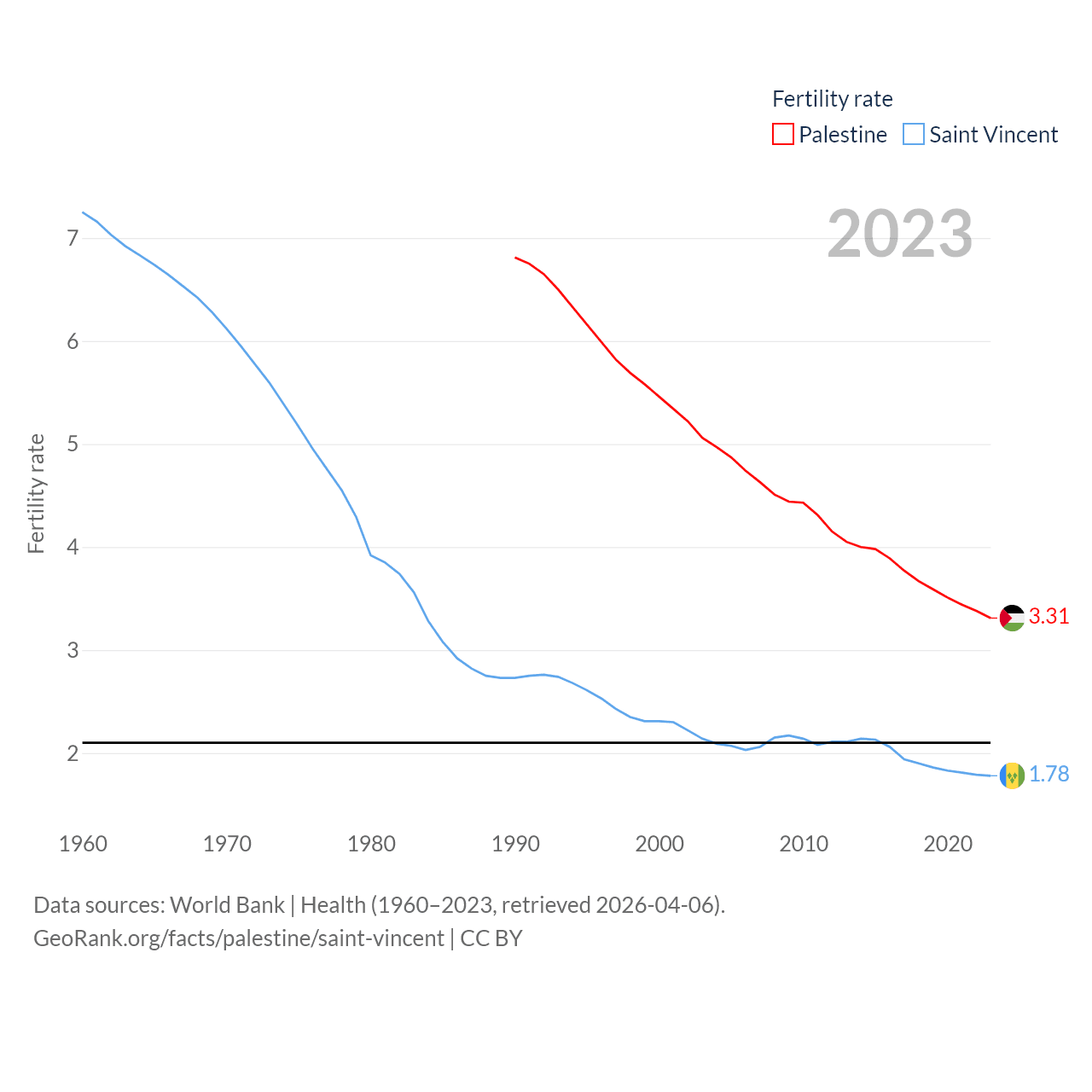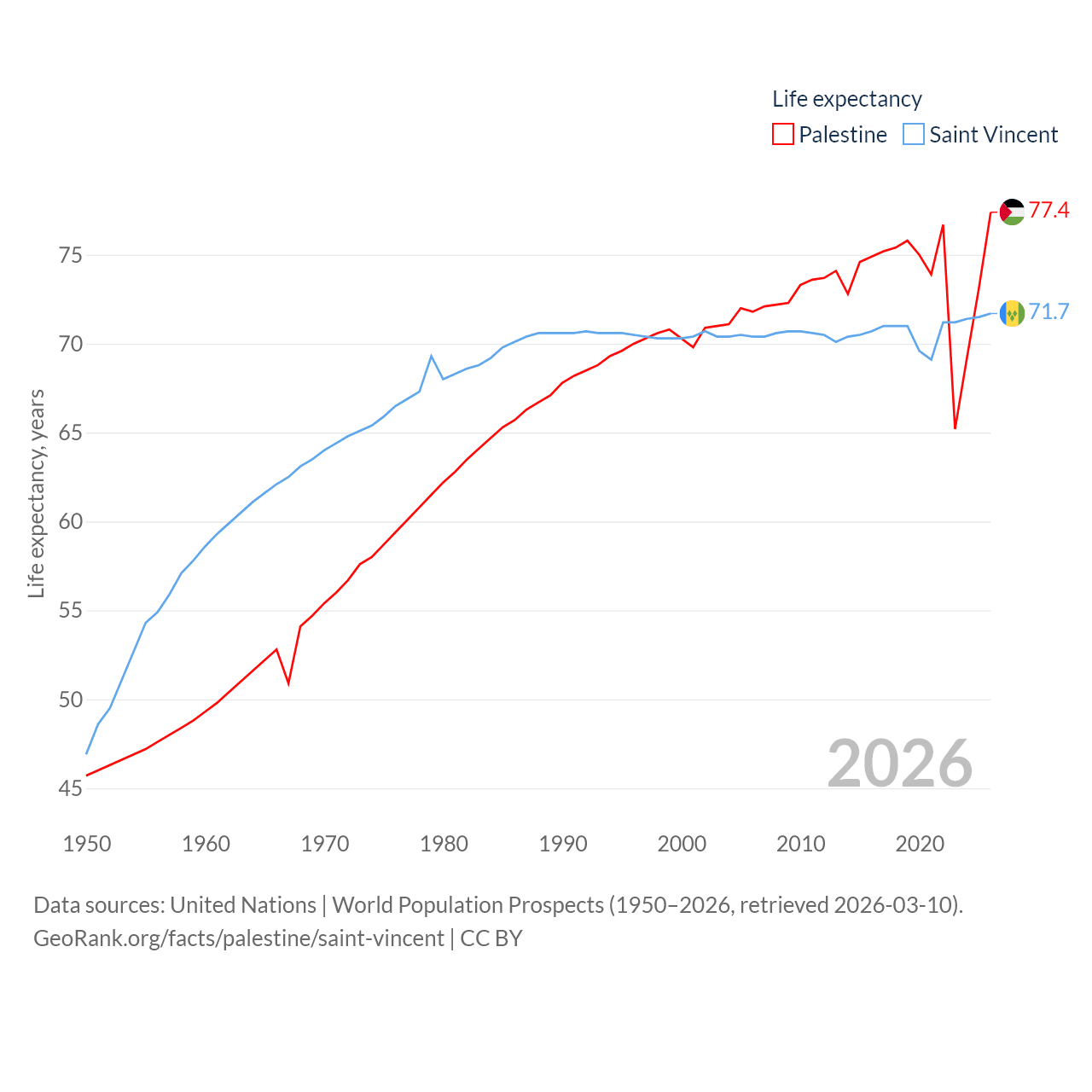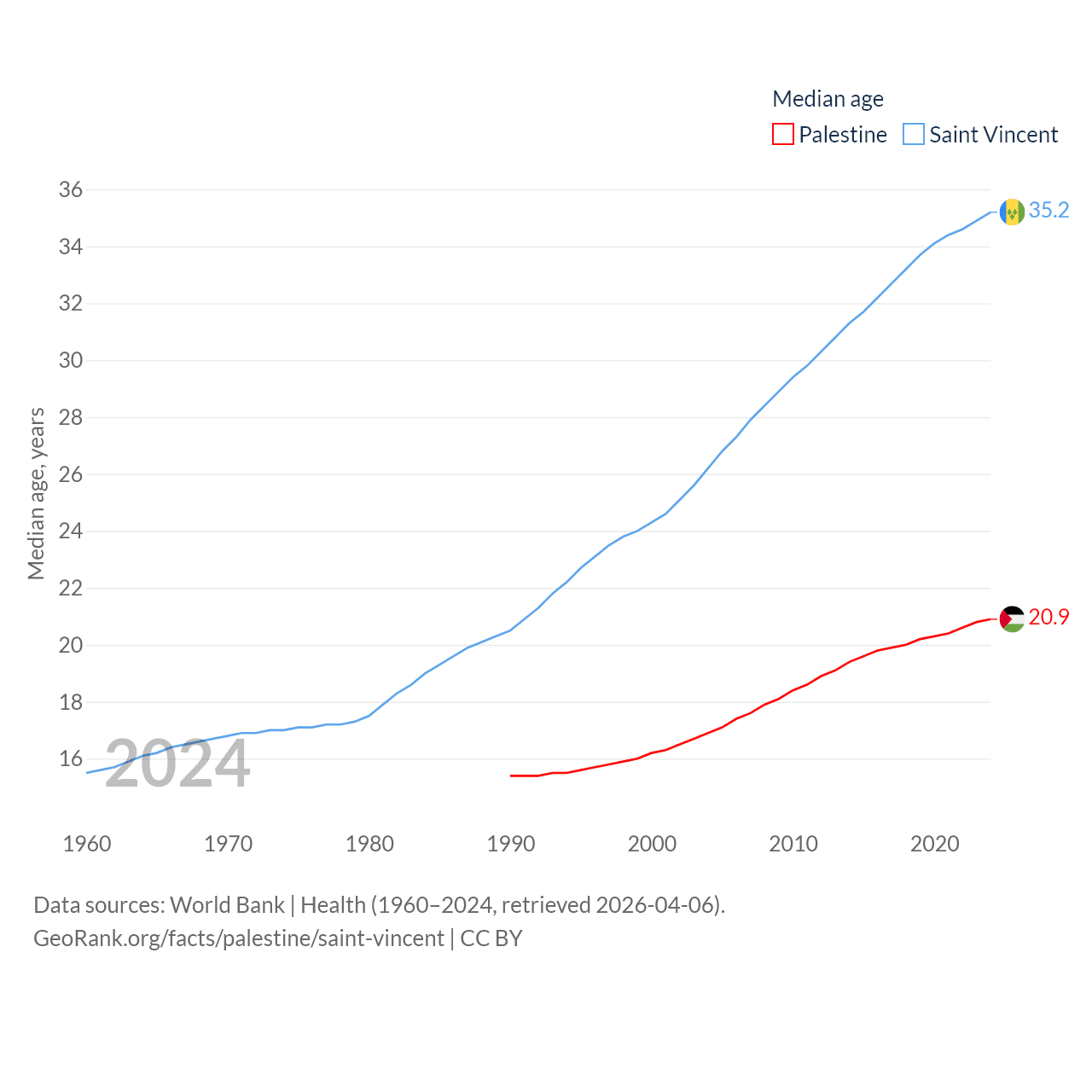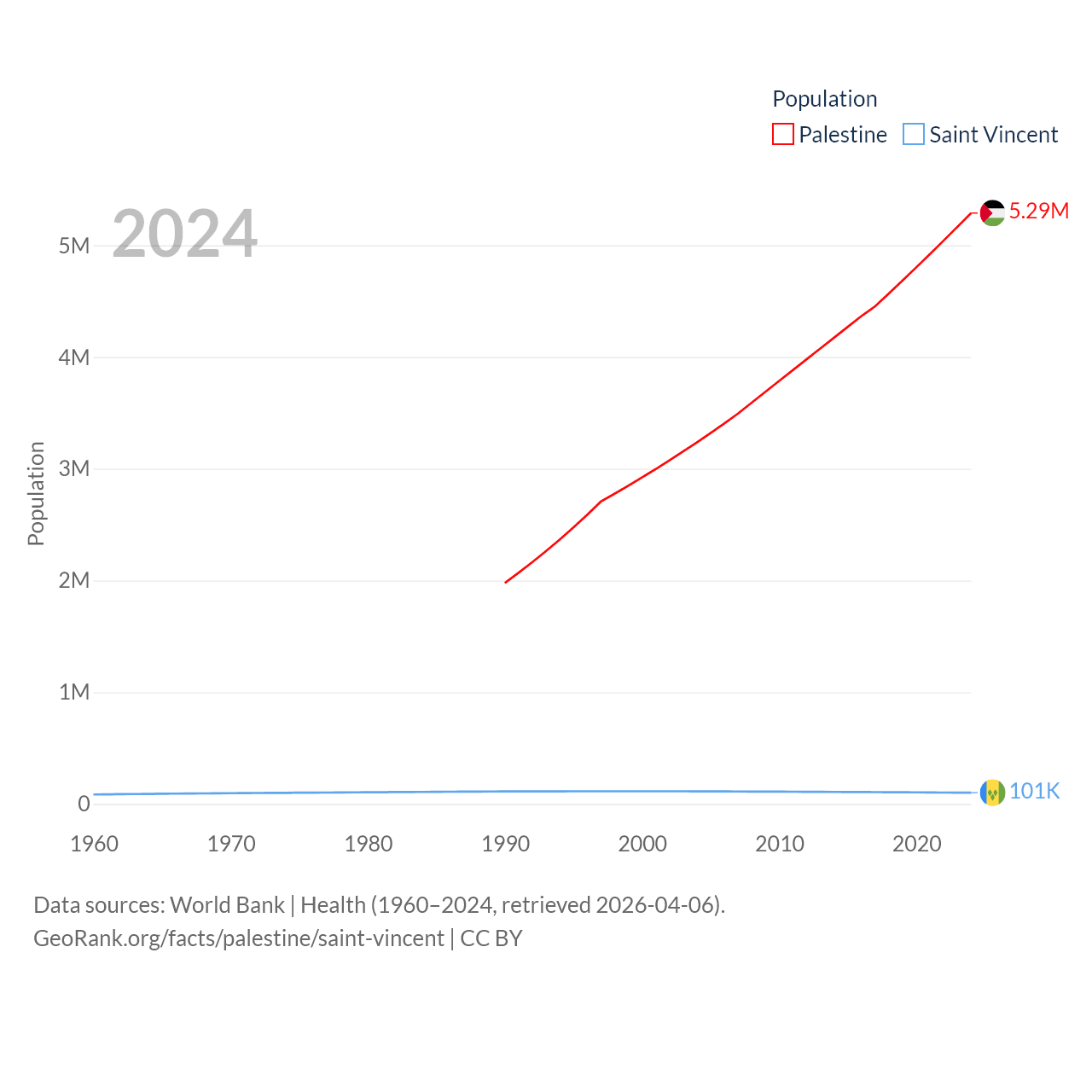 Palestine has a population of 5.29M (ranked 122/197), compared with 101K in Saint Vincent (ranked 184/197). Palestine's land area is 2,326 sq mi versus 150.6 sq mi for Saint Vincent (ranked 164th vs. 185th).