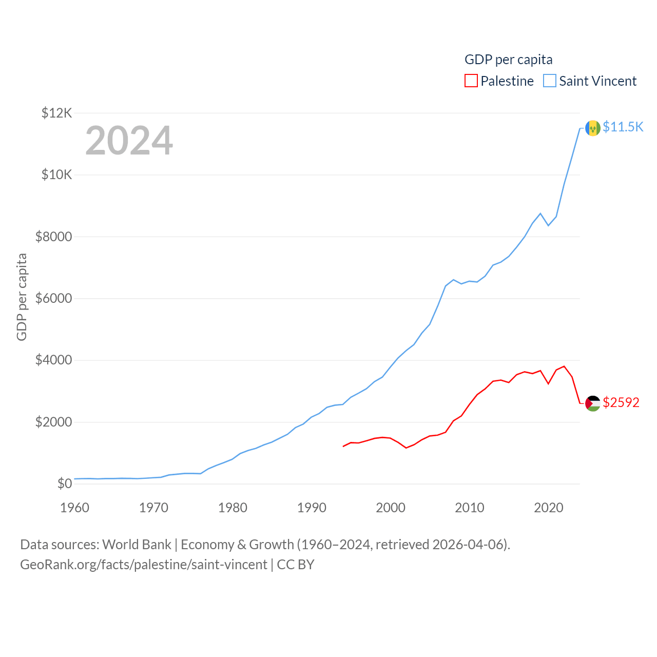 By GDP, Palestine ranks 146/197 ($13.7B) and Saint Vincent ranks 186/197 ($1.16B). By GDP per capita, Palestine ranks 147/197 ($2,592), while Saint Vincent ranks 81/197 ($11,501).