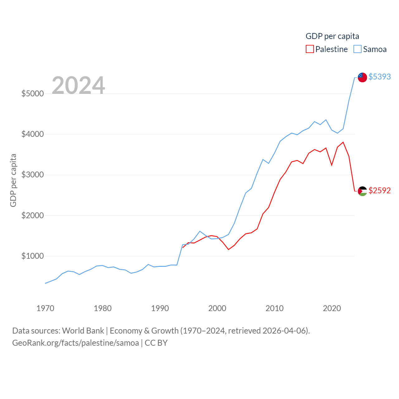 By GDP, Palestine ranks 146/197 ($13.7B) and Samoa ranks 185/197 ($1.18B). By GDP per capita, Palestine ranks 147/197 ($2,592), while Samoa ranks 117/197 ($5,393).