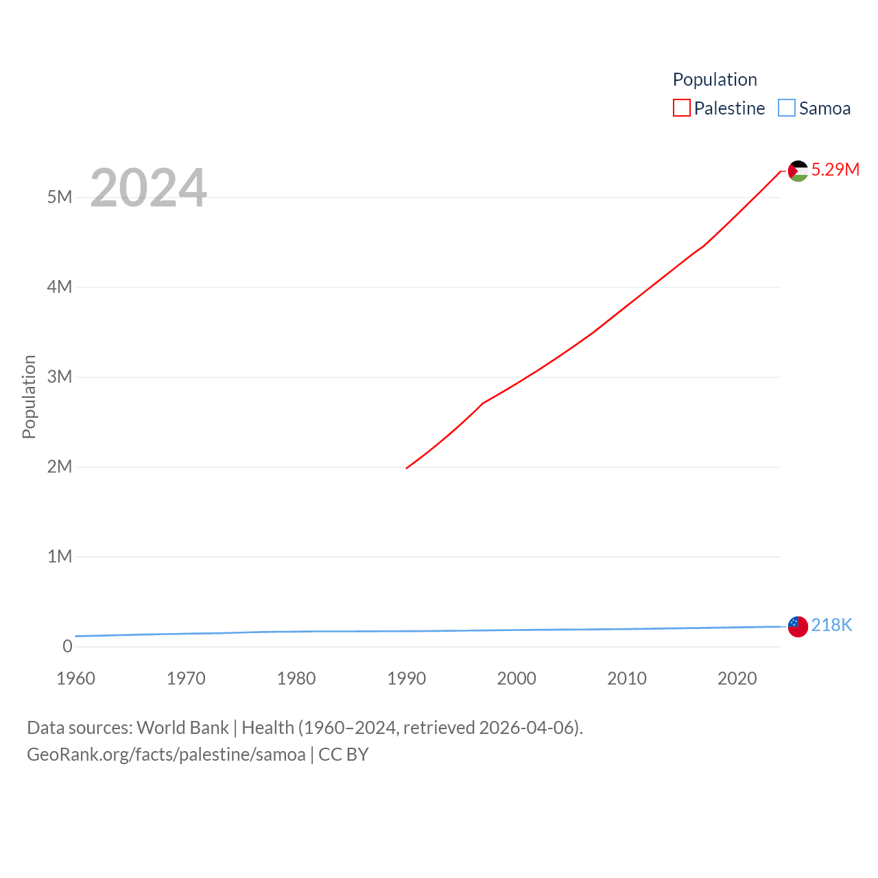 Palestine has a population of 5.29M (ranked 122/197), compared with 218K in Samoa (ranked 177/197). Palestine's land area is 2,326 sq mi versus 1,073 sq mi for Samoa (ranked 164th vs. 168th).