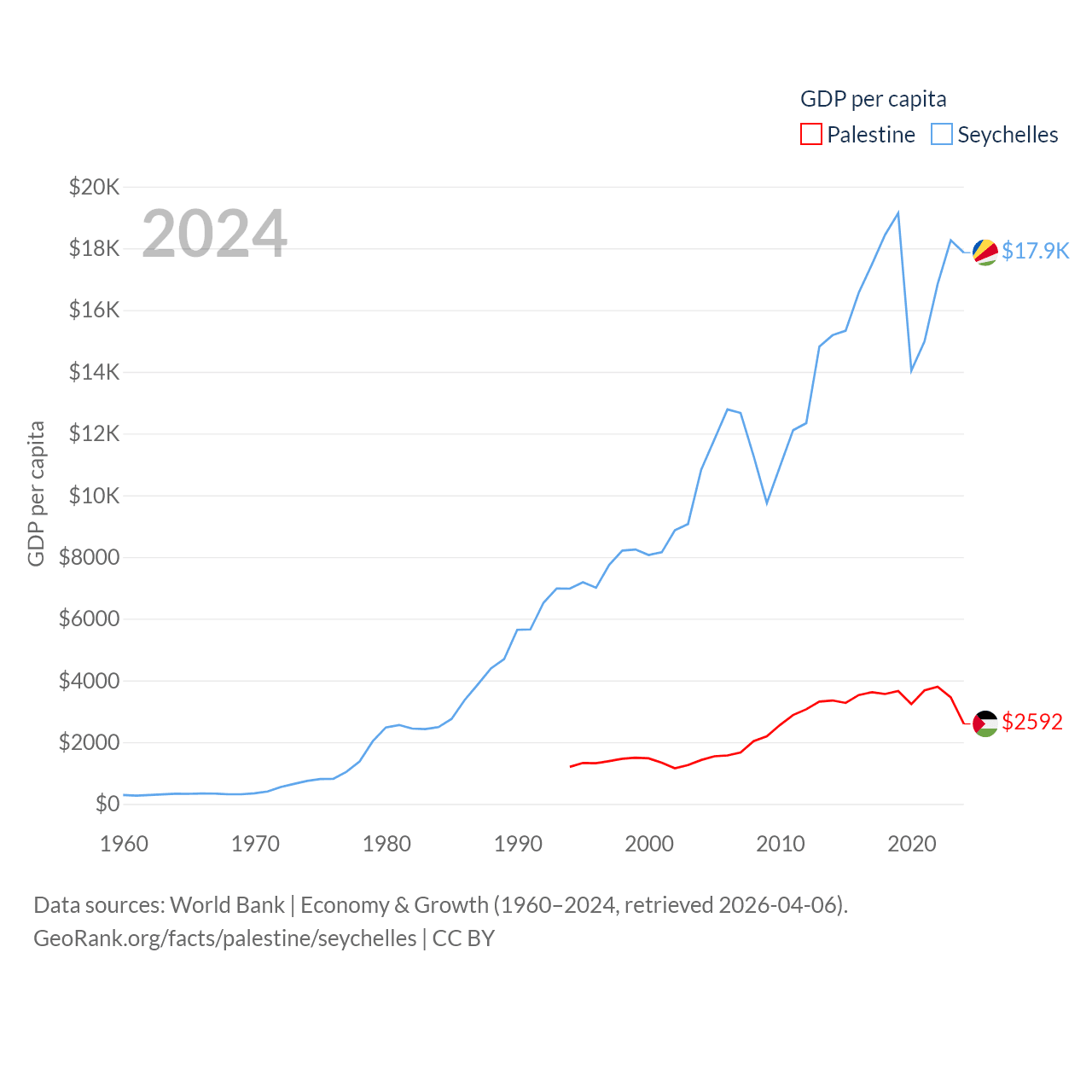 By GDP, Palestine ranks 146/197 ($13.7B) and The Seychelles ranks 178/197 ($2.17B). By GDP per capita, Palestine ranks 147/197 ($2,592), while The Seychelles ranks 63/197 ($17,859).
