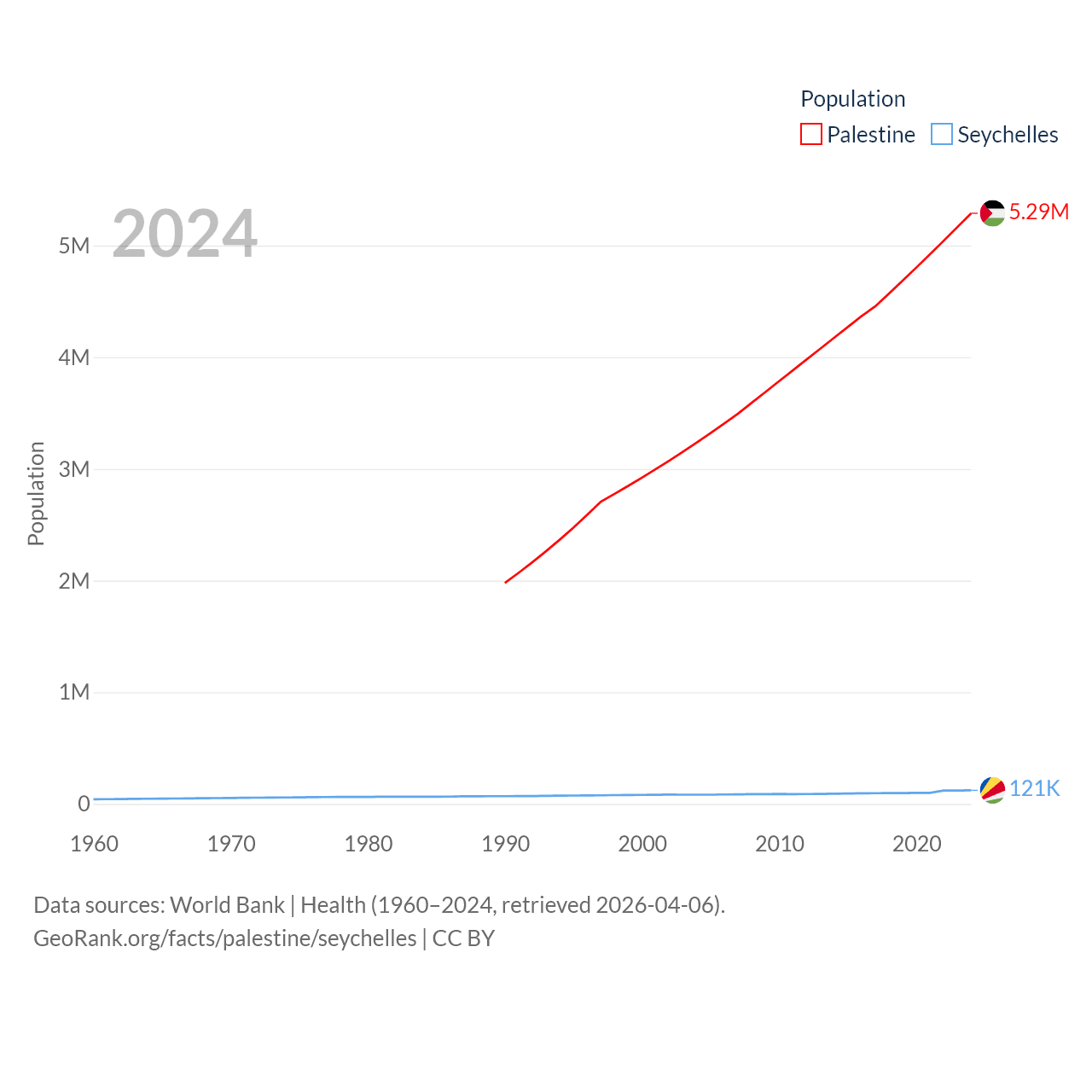Palestine has a population of 5.29M (ranked 122/197), compared with 121K in The Seychelles (ranked 181/197). Palestine's land area is 2,326 sq mi versus 177.6 sq mi for The Seychelles (ranked 164th vs. 181st).