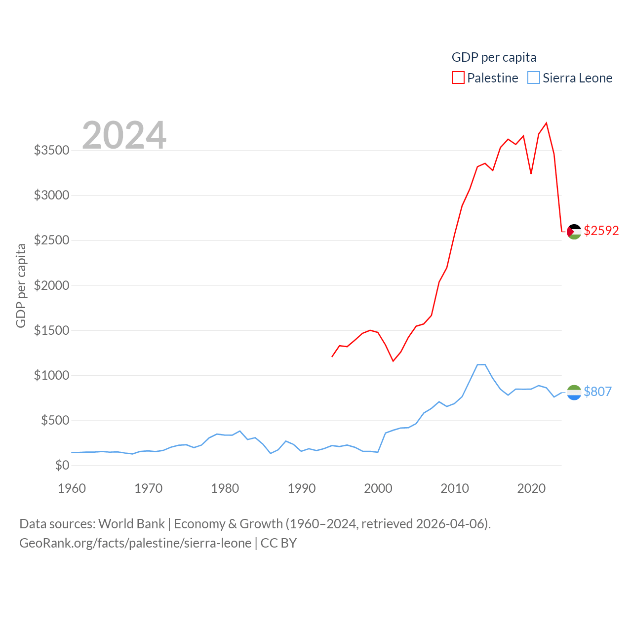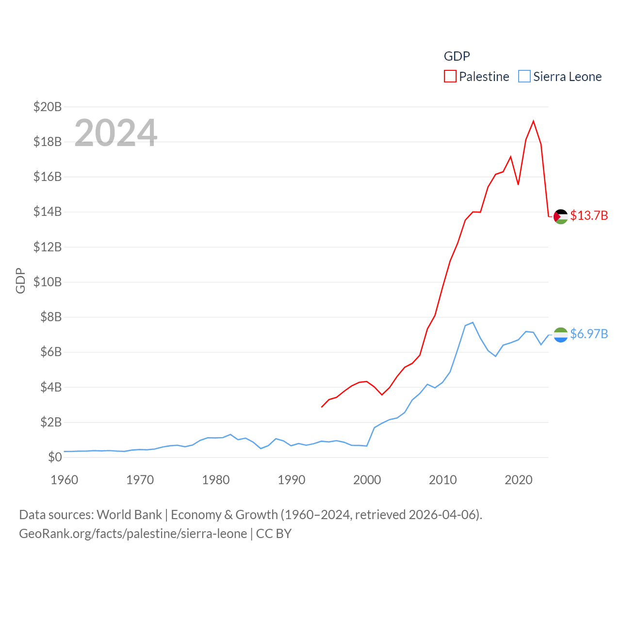 By GDP, Palestine ranks 146/197 ($13.7B) and Sierra Leone ranks 160/197 ($6.97B). By GDP per capita, Palestine ranks 147/197 ($2,592), while Sierra Leone ranks 186/197 ($807).