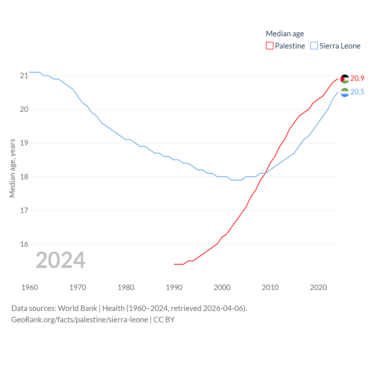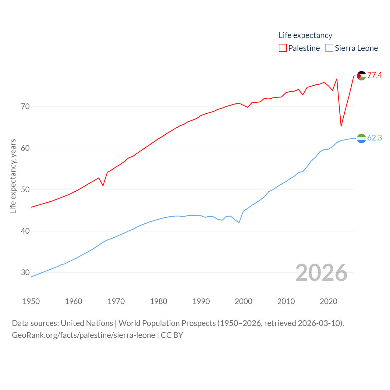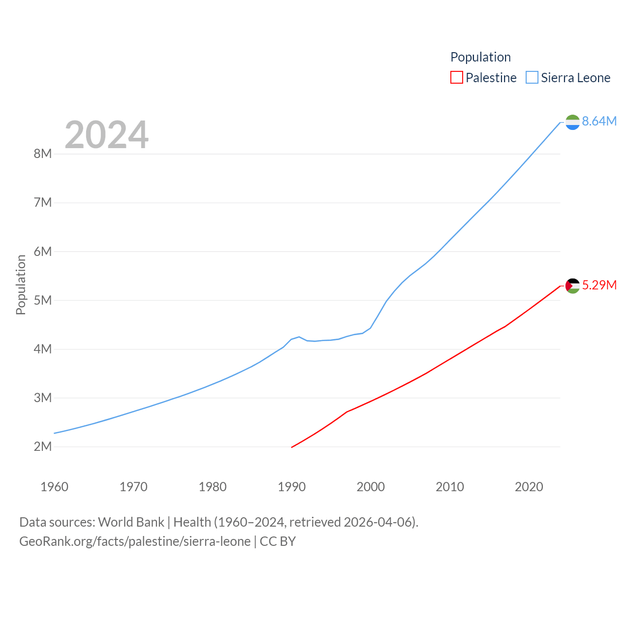 Palestine has a population of 5.29M (ranked 122/197), compared with 8.64M in Sierra Leone (ranked 102/197). Palestine's land area is 2,326 sq mi versus 27,869 sq mi for Sierra Leone (ranked 164th vs. 116th).