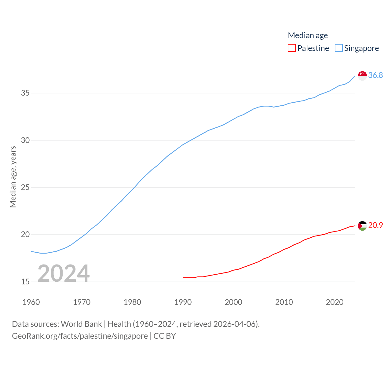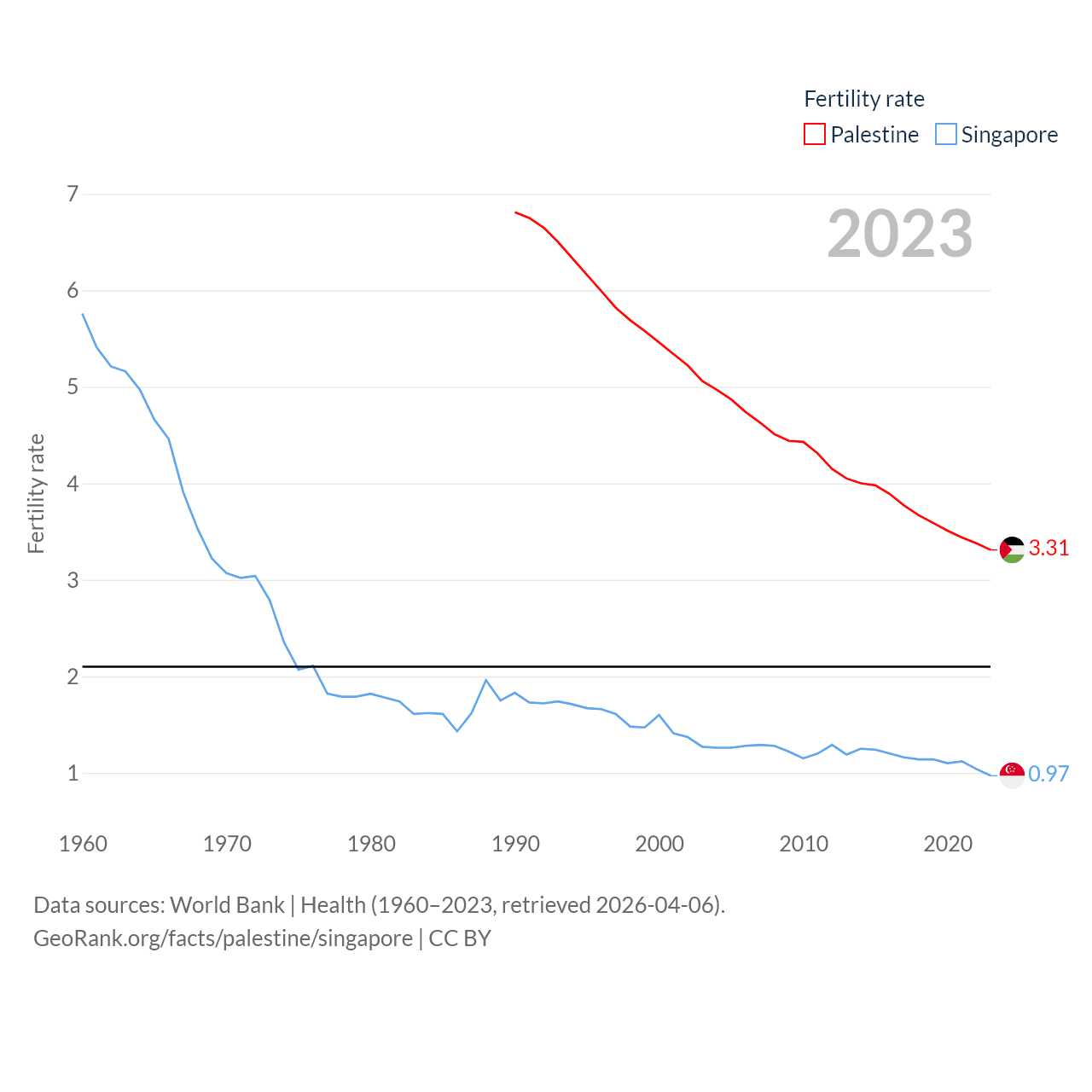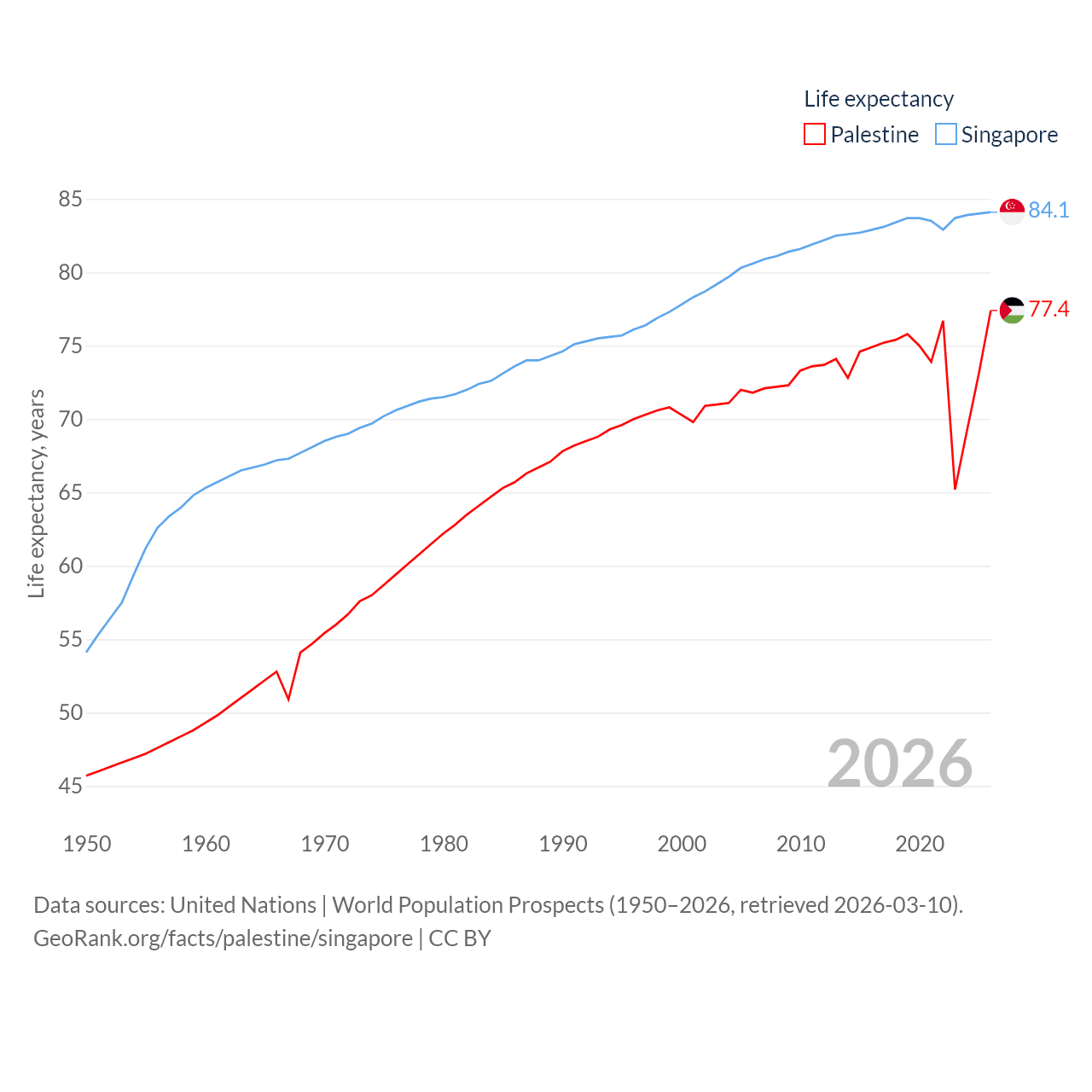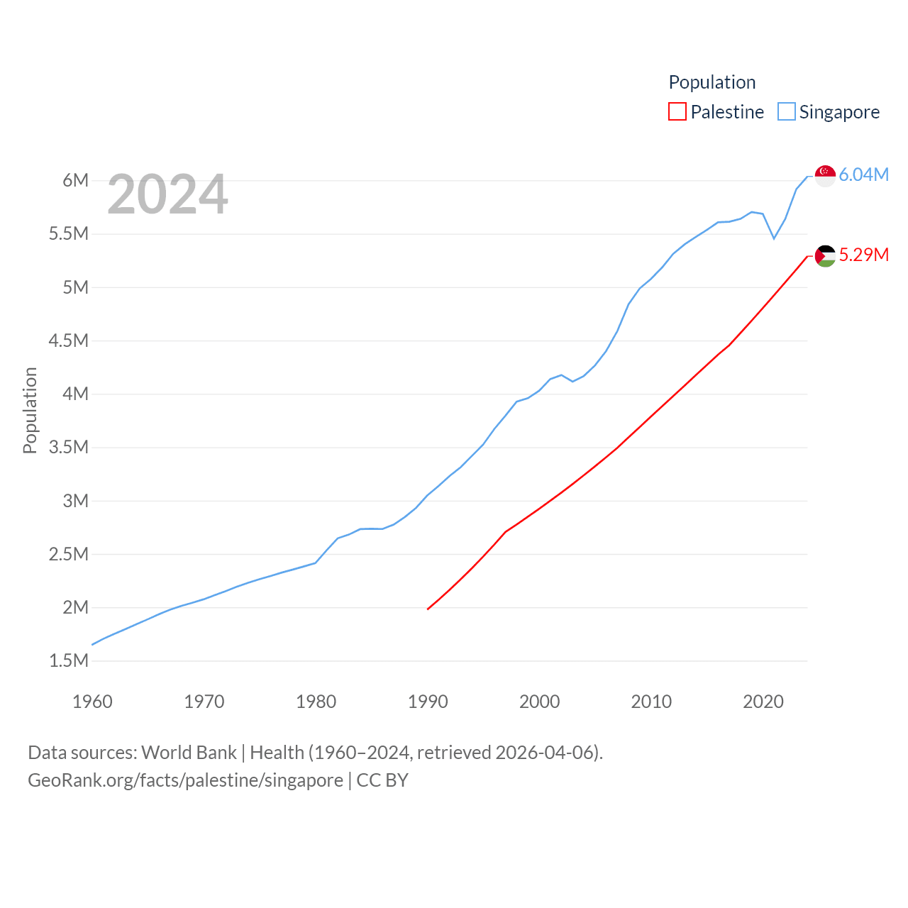 Palestine has a population of 5.29M (ranked 122/197), compared with 6.04M in Singapore (ranked 113/197). Palestine's land area is 2,326 sq mi versus 277.2 sq mi for Singapore (ranked 164th vs. 177th).