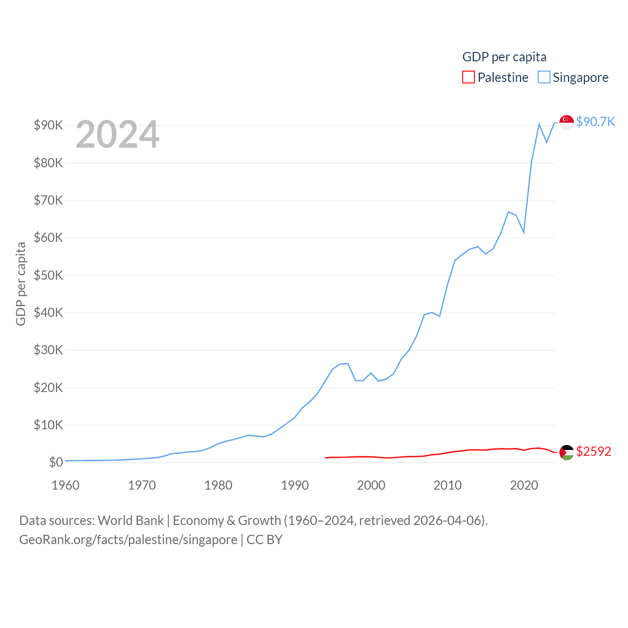 By GDP, Palestine ranks 146/197 ($13.7B) and Singapore ranks 28/197 ($547B). By GDP per capita, Palestine ranks 147/197 ($2,592), while Singapore ranks 7/197 ($90,674).