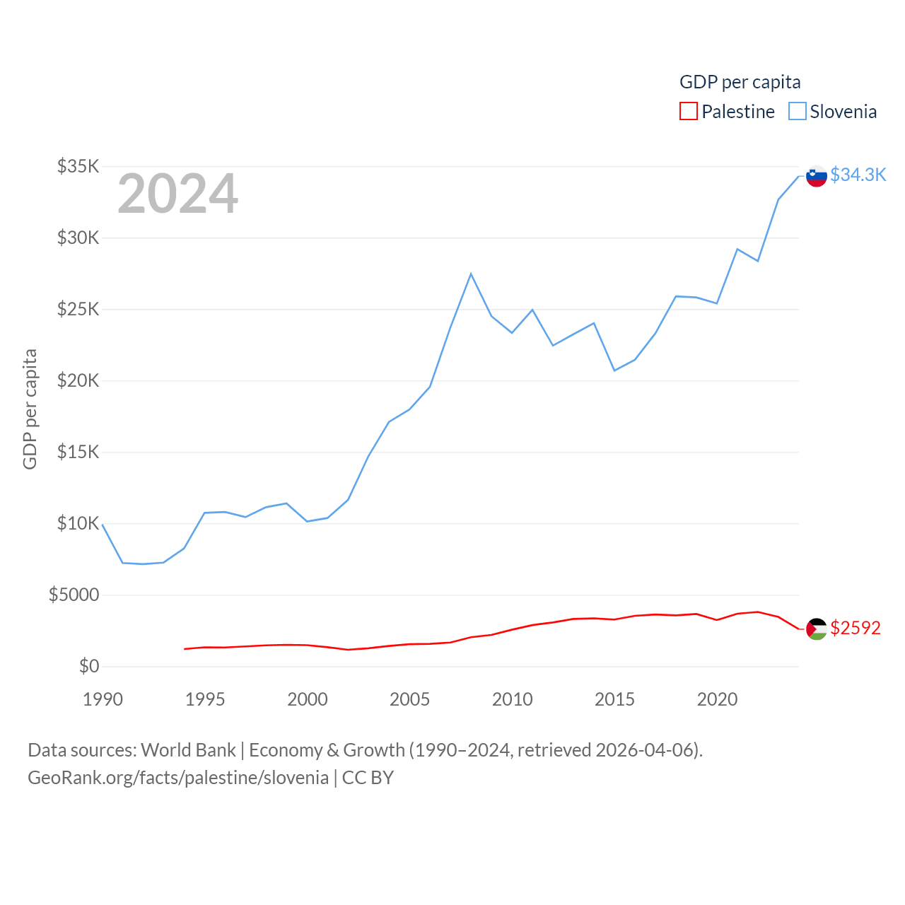 By GDP, Palestine ranks 146/197 ($13.7B) and Slovenia ranks 86/197 ($73B). By GDP per capita, Palestine ranks 147/197 ($2,592), while Slovenia ranks 34/197 ($34,301).